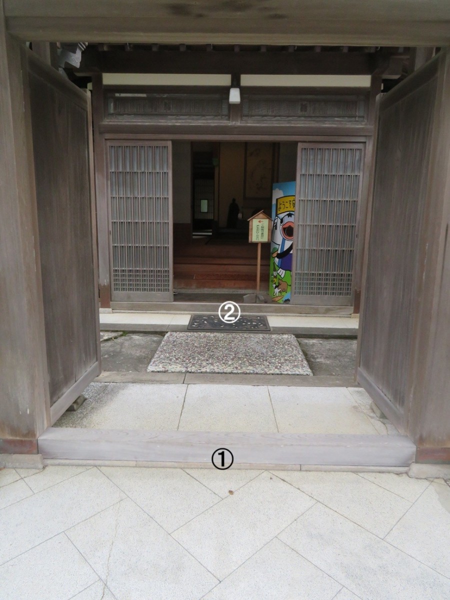 旧柏原邸入口 ※旧柏原邸は車いすであがることはできません またぎの高さ ①13センチ ②13センチ