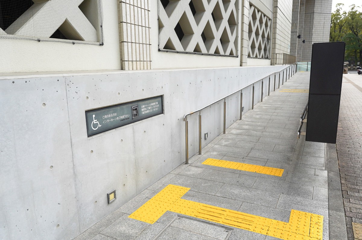 建物正面の階段の横にスロープがある(斜度4~5度)