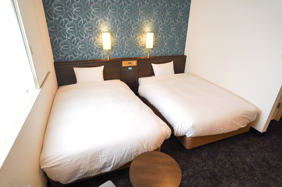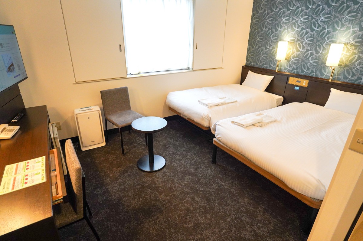 2階202号室ユニバーサルツインルーム バスタオルは車いすの方でも取りやすいようにベッドの上に置いている