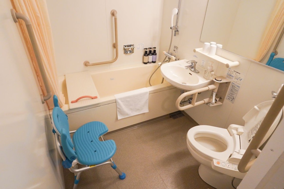 2階202号室ユニバーサルツインルーム トイレ・浴室・洗面台の様子 バスボード、シャワーチェア、滑り止めマットを備えている 入口の段差なし、入口幅70センチ