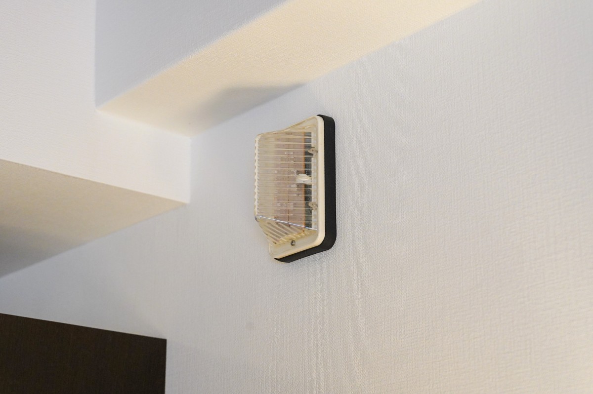 2階202号室ユニバーサルツインルーム 天井近くにあるランプ 火災報知器が発報した際、聴覚に障がいのある方にも伝わるよう点灯して知らせる