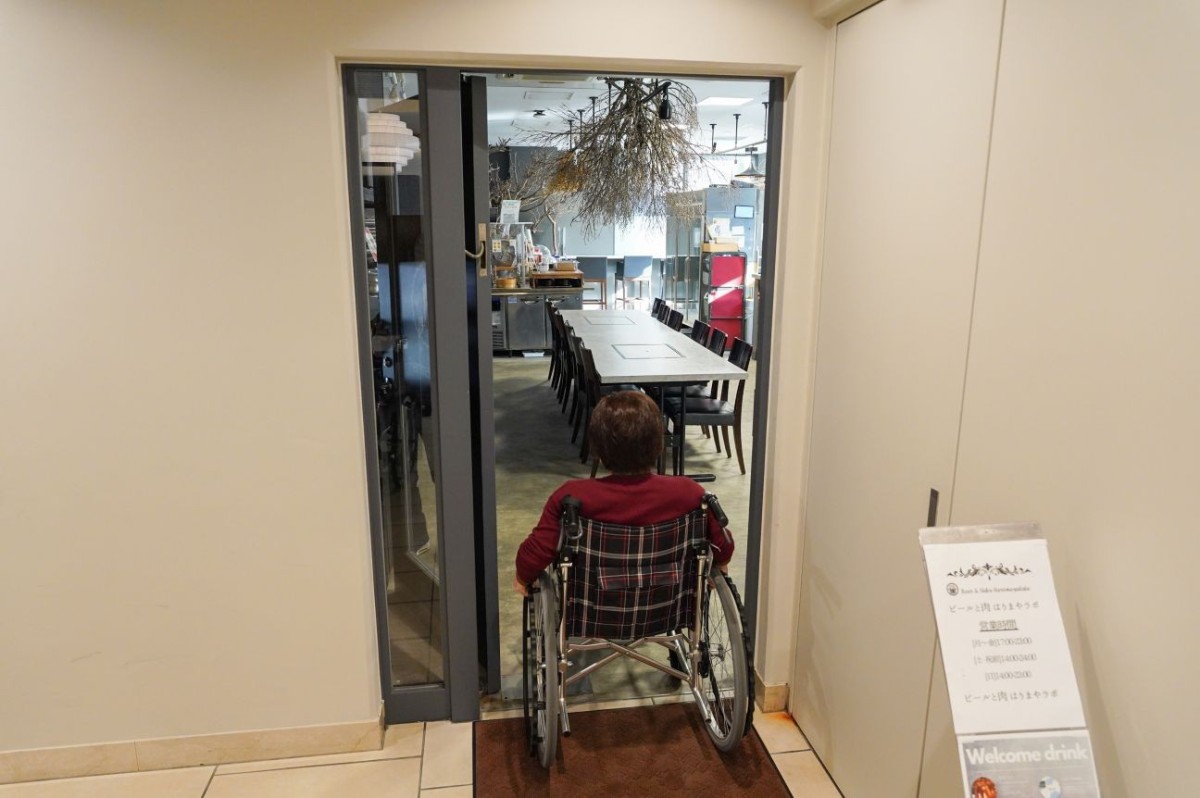 1階レストランの入口の様子 入口幅82センチ 朝食の時間帯は出入口が一方通行になるため、北側入口が入口になるが、車いすでは通りにくい。 出口からの対応が可能ですので、車いすでお越しの方はスタッフにお声がけください