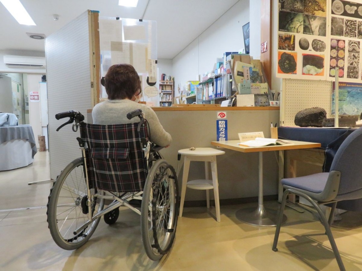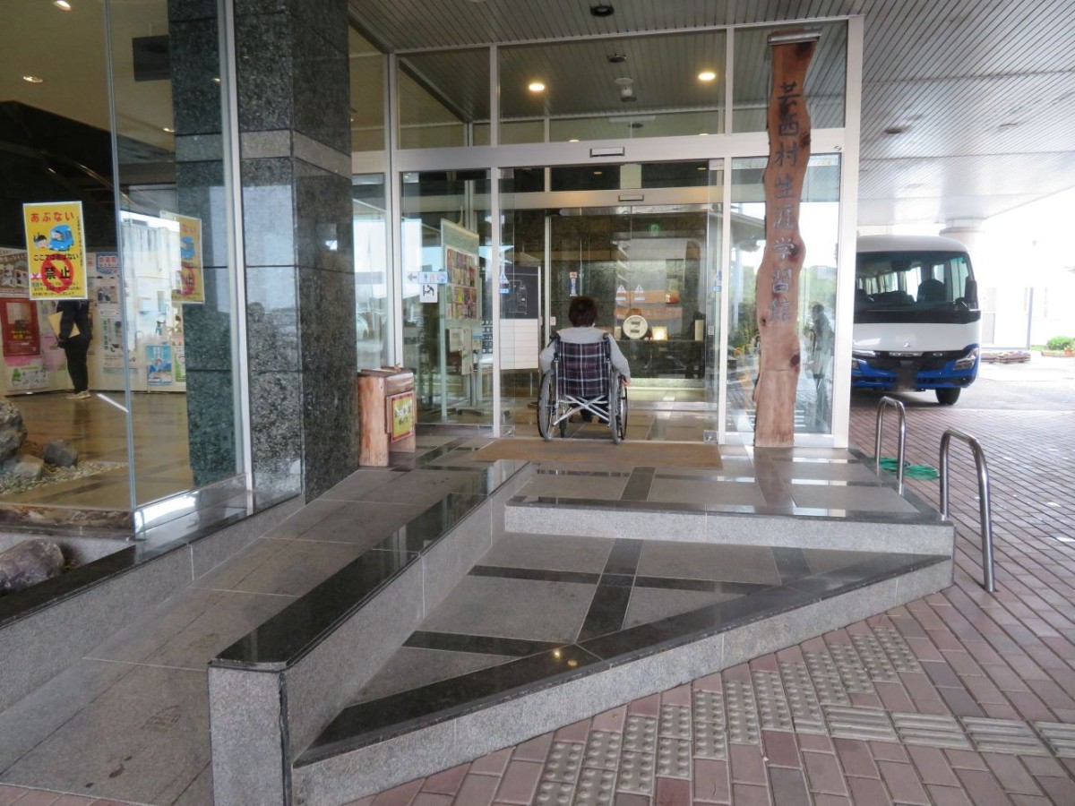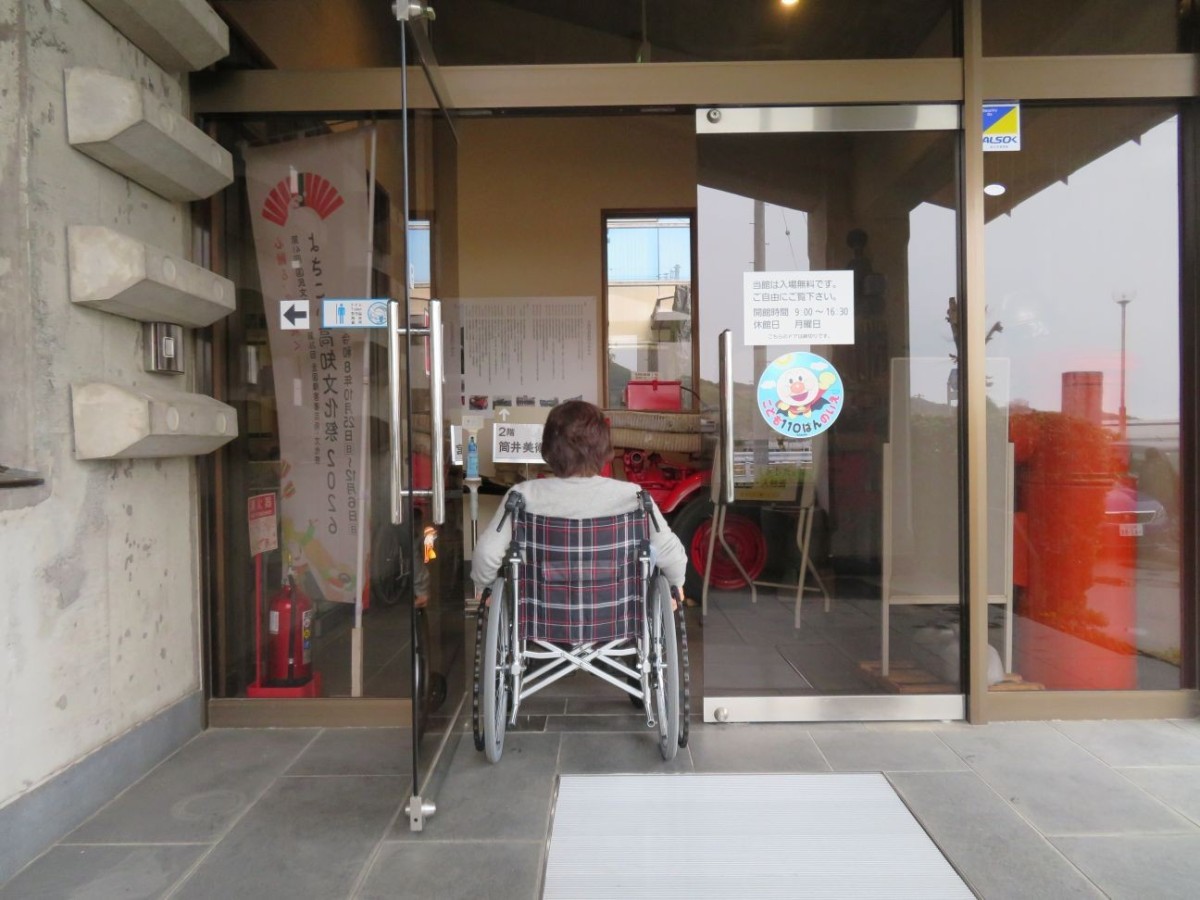 隣の生涯学習館入口の様子 自動ドア 入口は十分広い 段差2段 スロープあり 斜度5度