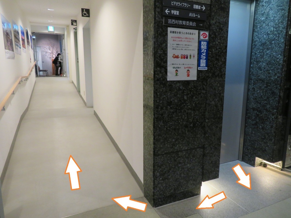 生涯学習館のエレベーター 2階で降りると筒井美術館への渡り廊下がある