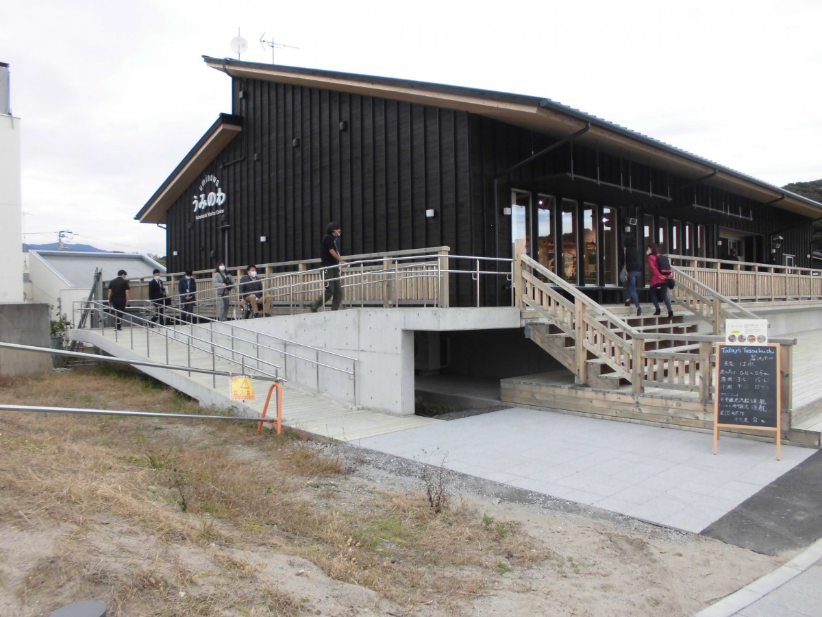 足摺宇和海国立公園竜串ビジターセンター「うみのわ」を訪れました。「うみのわ」は竜串を含む足摺宇和海国立公園の自然情報、利用情報を広く発信する拠点です。館内では様々な展示をはじめ、シャワールーム、授乳室やキッズコーナーなど設備も充実しており、テラスでくつろぐこともできます。今回は「うみのわ」でビーチ用車いすをお借りして車いすで砂浜を散策してみました。