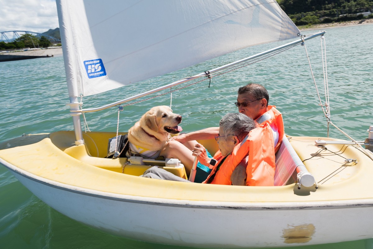 全盲の夫妻(お一人は車いす利用)がYASU海の駅クラブで、盲導犬と一緒にハンザクラスを体験しました。ハンザクラスは転覆しない工夫がされた、誰でも簡単に操作できる小型ヨットです。安全にセーリングを楽しむことができます。