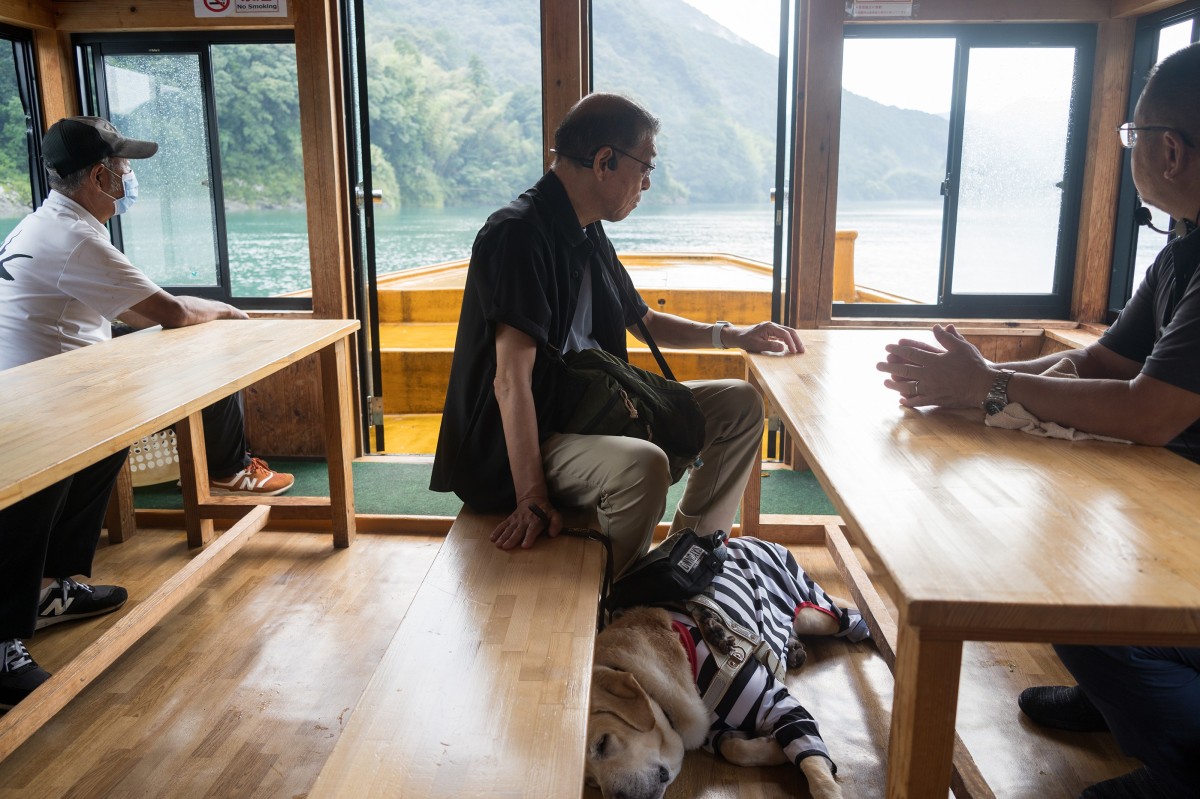 全盲の夫妻(お一人は車いす利用)が四万十市の「四万十川屋形船なっとく」で、盲導犬と一緒に屋形船を体験しました。この日はあいにくの雨模様でしたが、四万十川のせせらぎや風を感じながら遊覧を楽しみました。