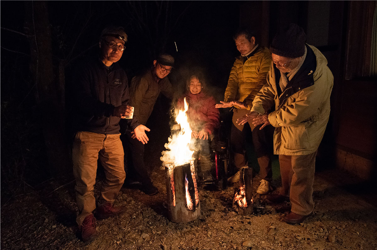 冬の夜空の下、燃え盛る一つのトーチを仲間と囲むのは、とても贅沢な時間です。車いすユーザーはトーチが倒れた場合など、とっさに避けることができないので、近づきすぎは禁物ですが、そもそも火力が強いので、熱すぎてあまり近寄れません! トーチの火で料理をするのもよさそうです。友人や家族といっしょに、ぜひチャレンジしてみてください。ただし、火の始末には十分ご注意を。