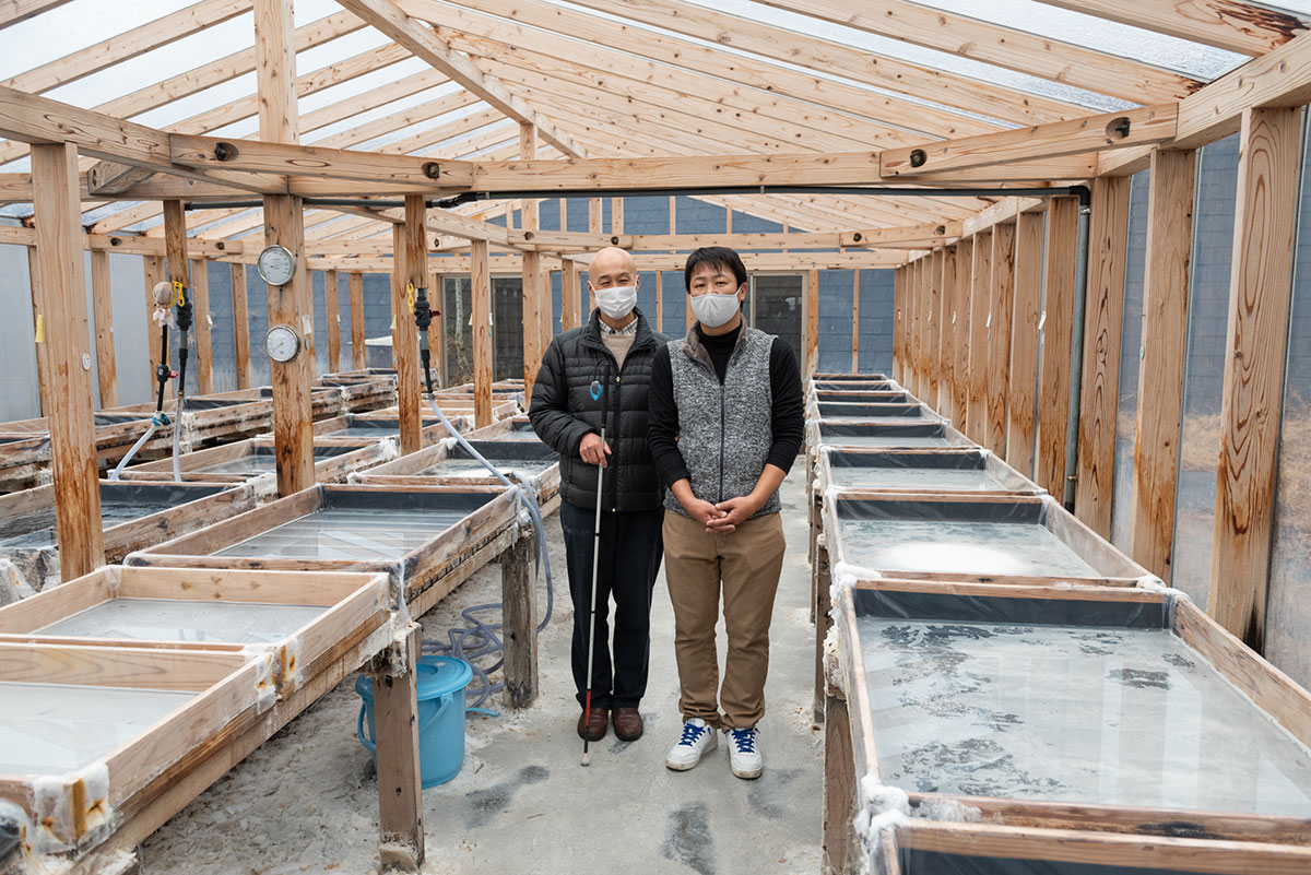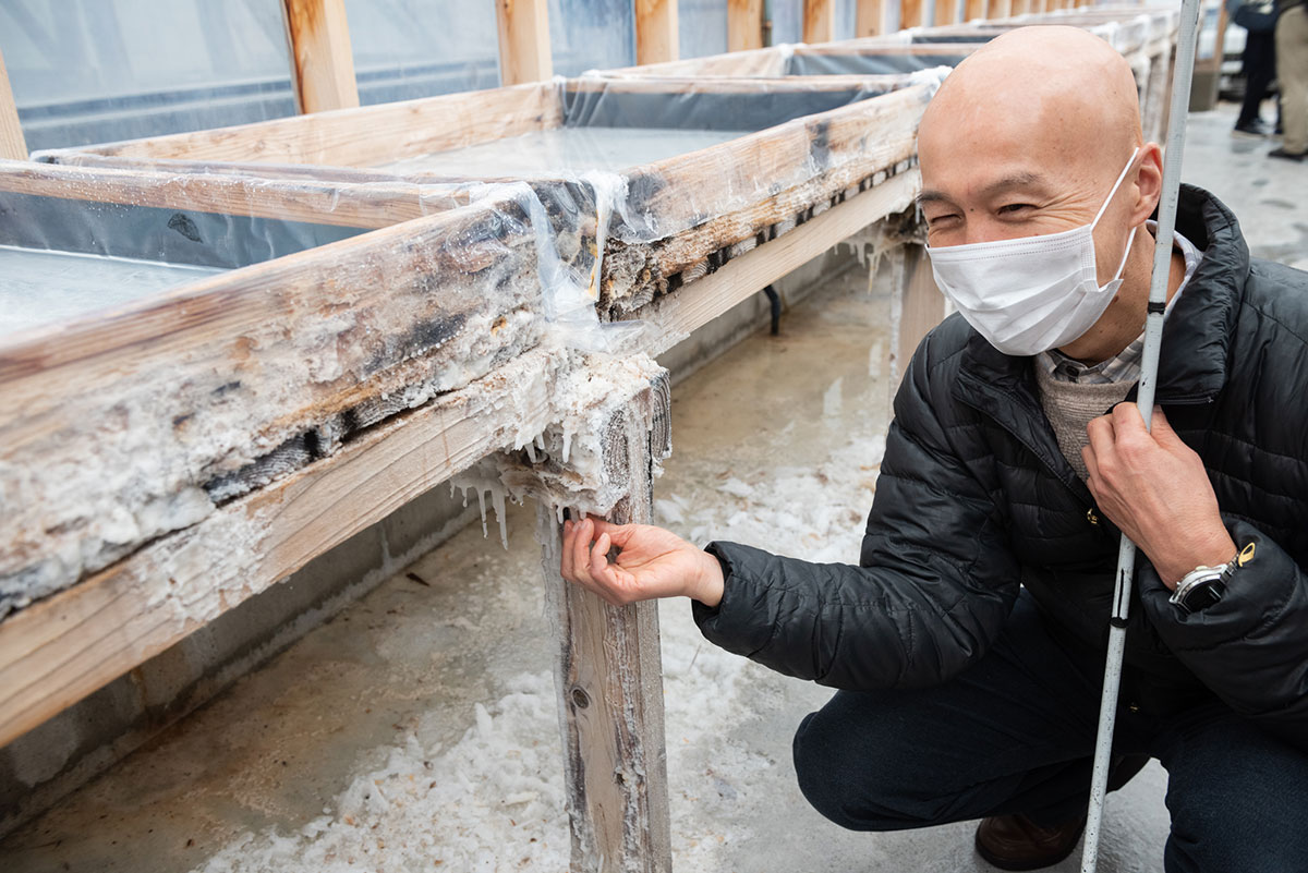 田野町完全天日塩製塩体験施設は、日本でも数少ない完全天日塩の塩づくり体験ができます。ここでは、太陽熱と風力の自然エネルギーだけで塩を作っています。高温ハウス内で塩の香りを感じながら、ガイドさんからお話を聞きました。