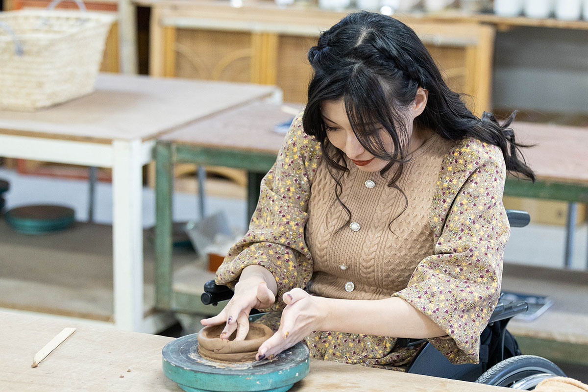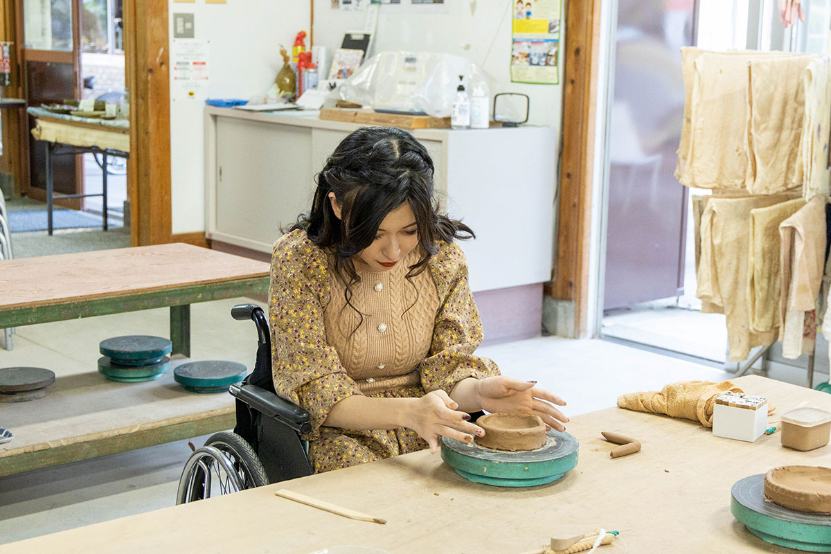 内原野陶芸館で手びねり体験をしました。まずは、どういった物を作るのかを決めます。悩みましたが、他の方が作っている作品などを見ながらイメージをわかせます。工房内はほぼフラットで車いすで回れます。今回は、肉じゃがを入れるお皿を作ることにしました。