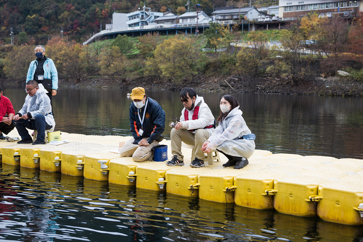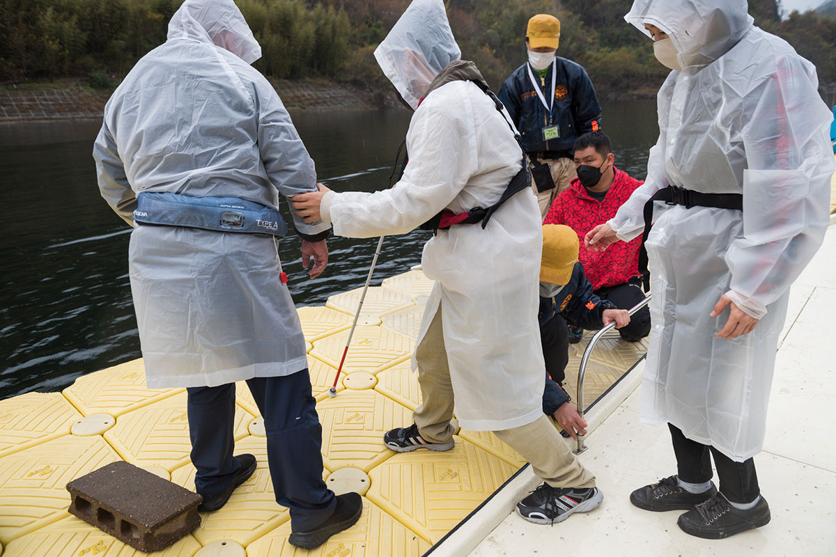 集合場所は、村の駅結いの里。受付をして釣り場所へ移動。車で1分ぐらい。乗船場まで友人の介助で下り、ボートへの乗降はスタッフの方がサポートしてくれました。