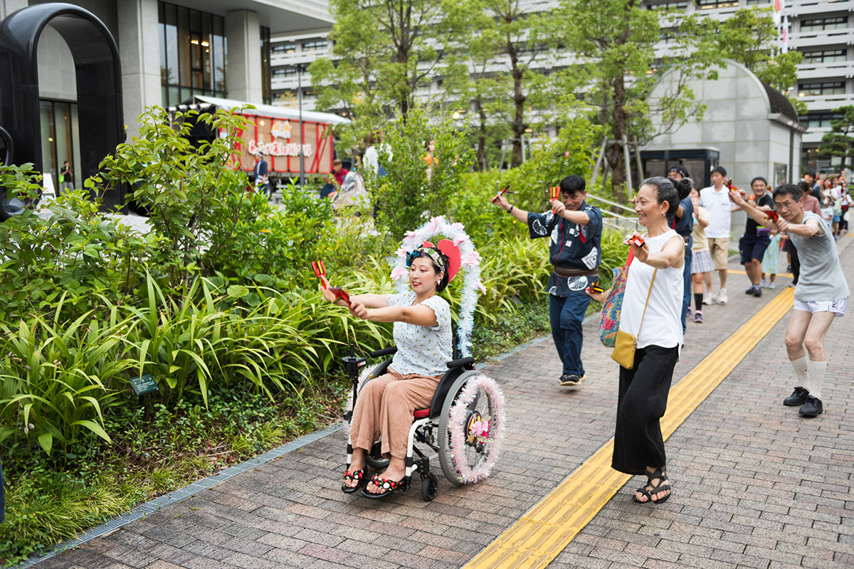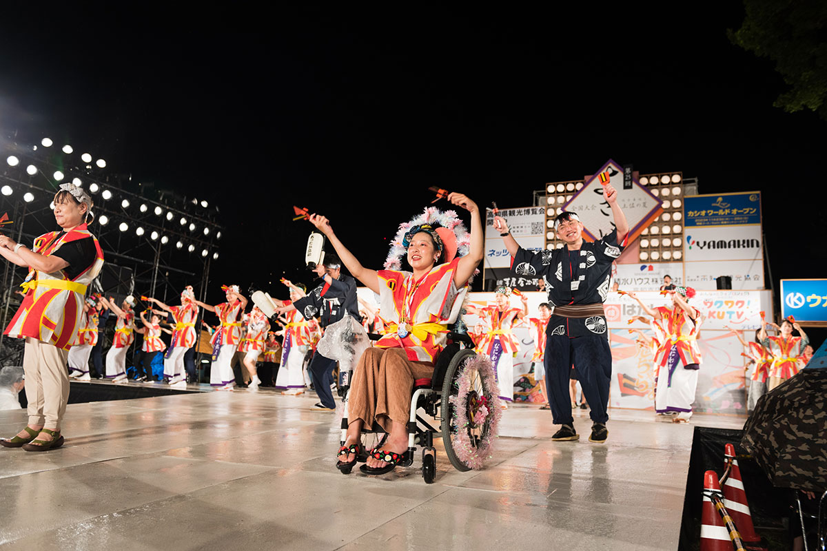 「あったか高知踊り子隊」は踊りのうまさを競うようなチームではなく、初心者でも、どんな方でも楽しく参加できるチームです。練習の時から、ほかの参加者やスタッフの方たちとお話ししながら過ごすので、本番が終わる頃には家族のような一体感が生まれて、それがとても嬉しかったです。車いす利用者でもみんなと一緒に練習して、祭りに参加して、団らんできるなんてすごいです! 夏の高知旅行のアクティビティのひとつとして、おすすめです。