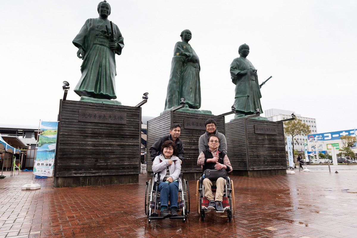 JR高知駅前の幕末3志士像前にて。人気の記念撮影スポット。