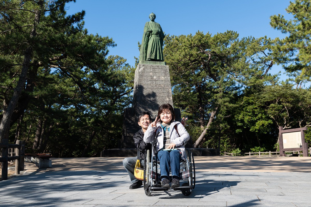 桂浜では龍馬と一緒に記念撮影も。像の前までスロープと坂道が続くため介助者の同行が望ましい。晴れた日の午前中であれば龍馬の顔もくっきり撮影できる。