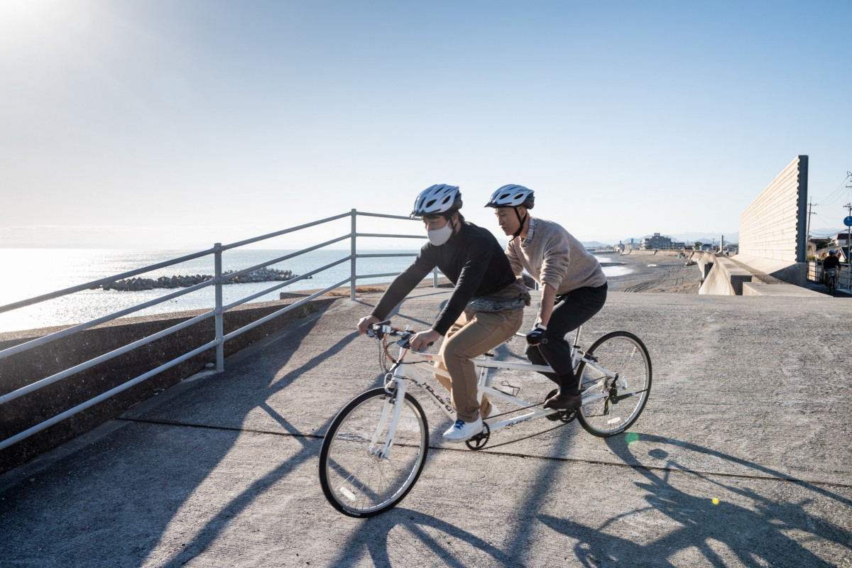 タンデム自転車に乗って海沿いをサイクリング。急な坂道もあるので注意。