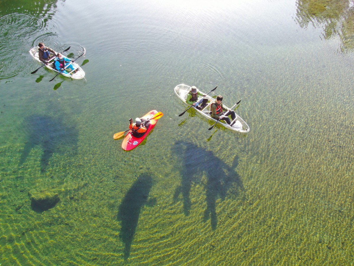 仁淀川アウトドアセンター。クリアカヤックの舟上から眺める透明度抜群の仁淀ブルー(透明度が高く青々とした仁淀川の流れ)。経験豊富なインストラクターの指導のもと、周囲の美しい自然を楽しむことができる。