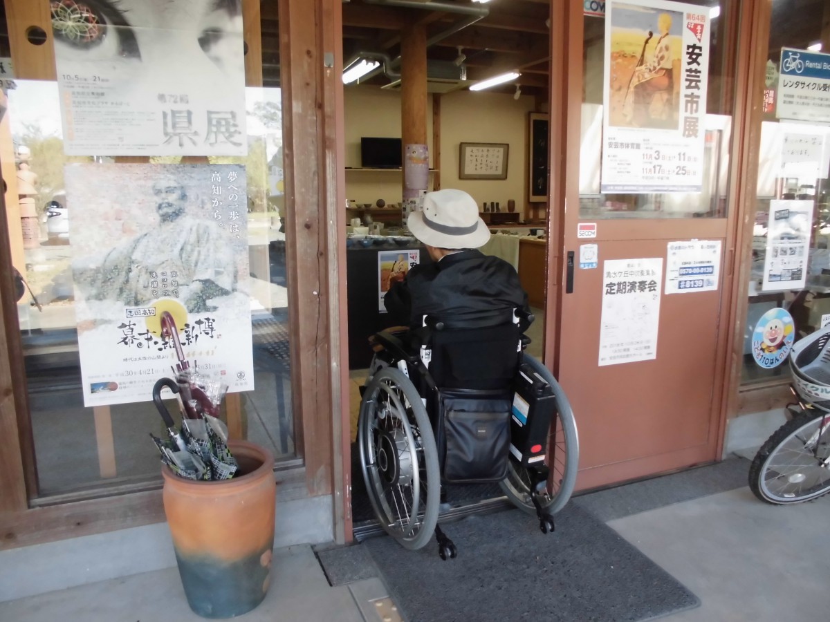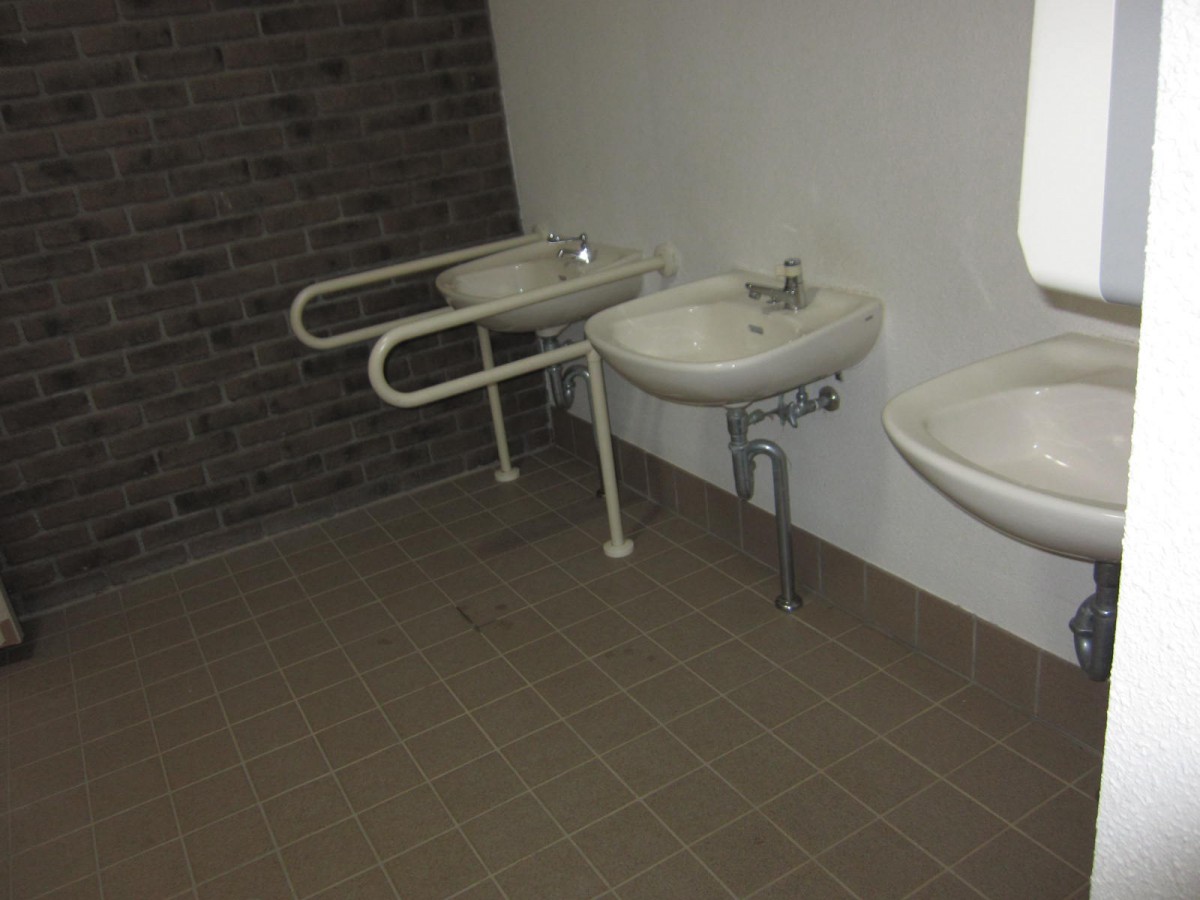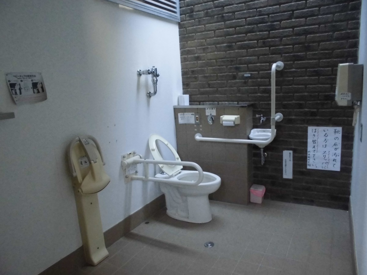 多目的トイレ トイレへの通路には水はけ用の溝があり、車いすやベビーカーは少しタイヤがひっかかるので注意