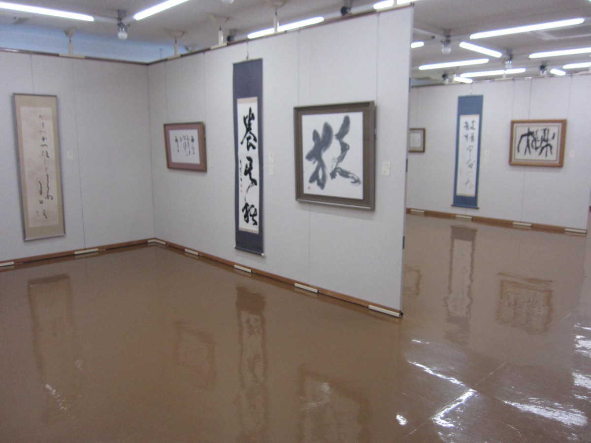 展示室の様子 建物内は通路も広い 作品にあわせて照明を落としている展示もある