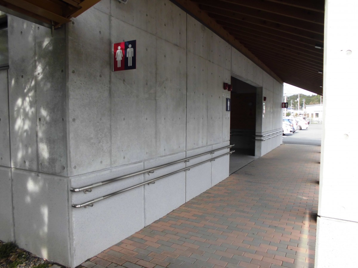 東側 トイレ棟 壁面からトイレ内まで手すりが続いている トイレ入口に触地図あり