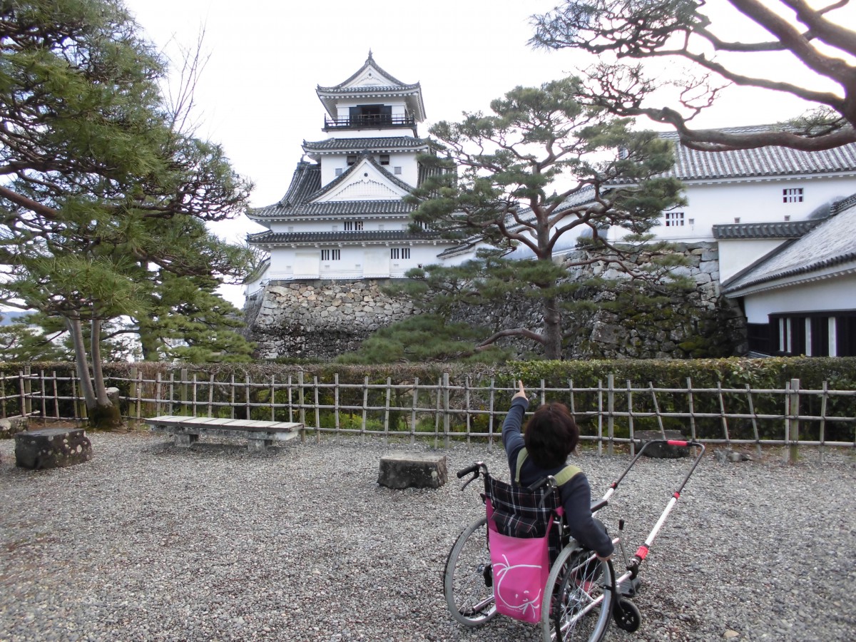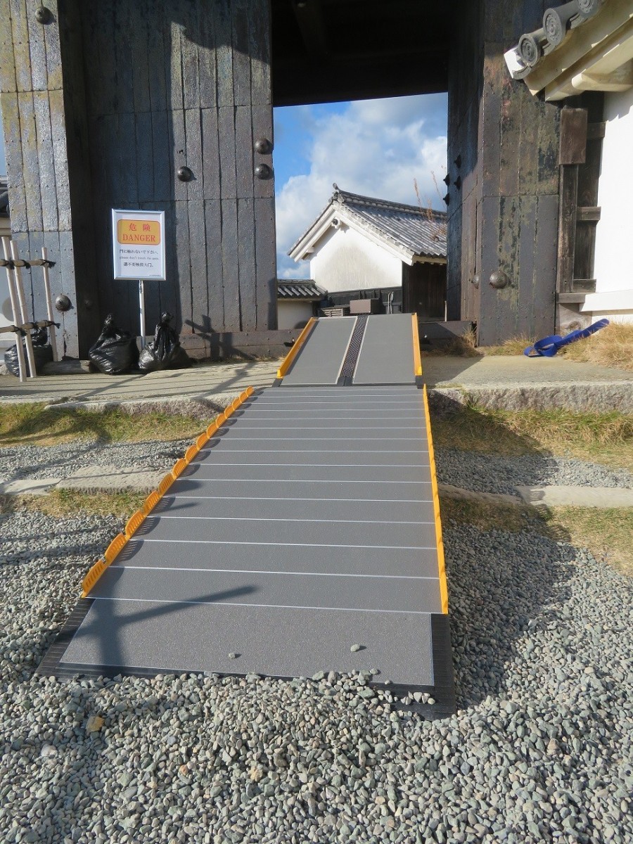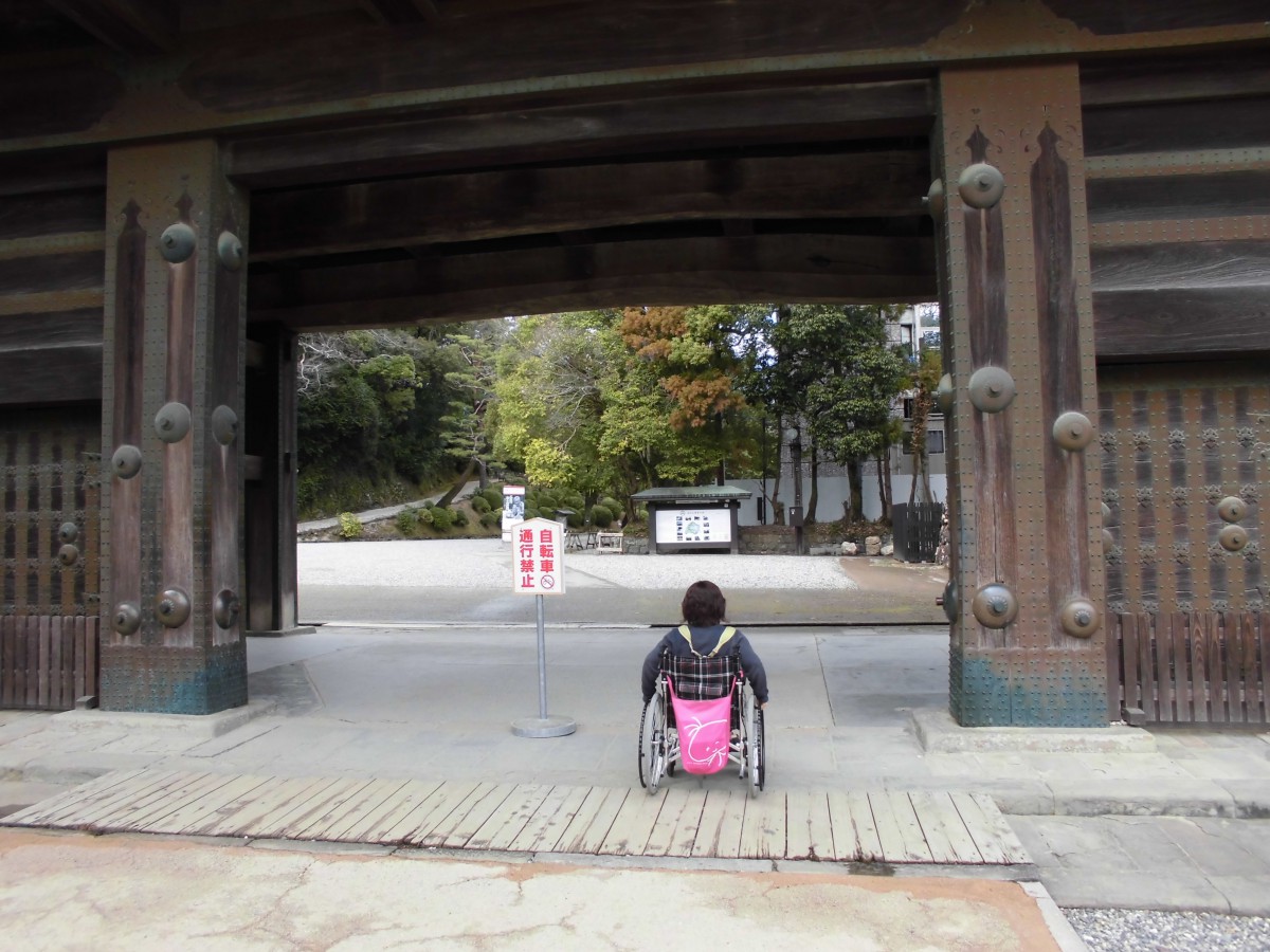 車いすの方は随伴者がいないと昇り降りが難しい 城内散策は牽引道具の使用が望ましい