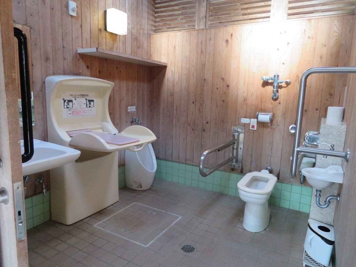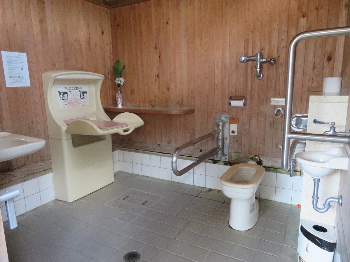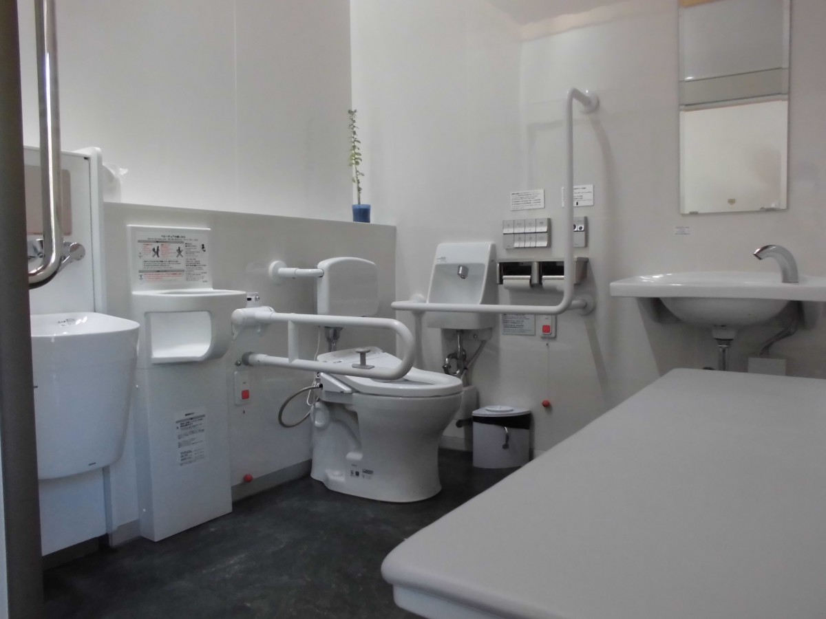 追手門 西側 多目的トイレ スライド戸 入口幅88センチ 便器に向かって右側に固定L字、左側に可動式U字手すりあり オストメイト、ベビーチェア、大人用介助シートあり