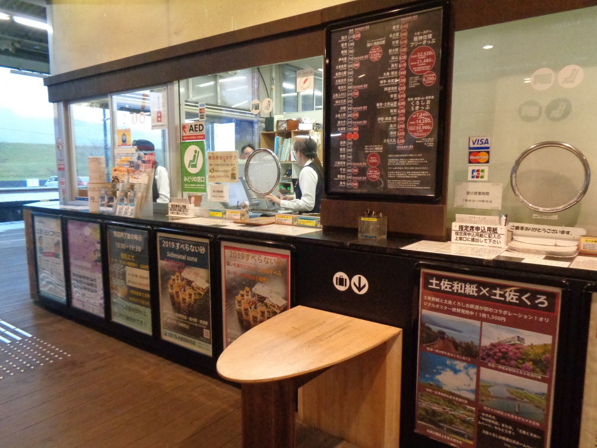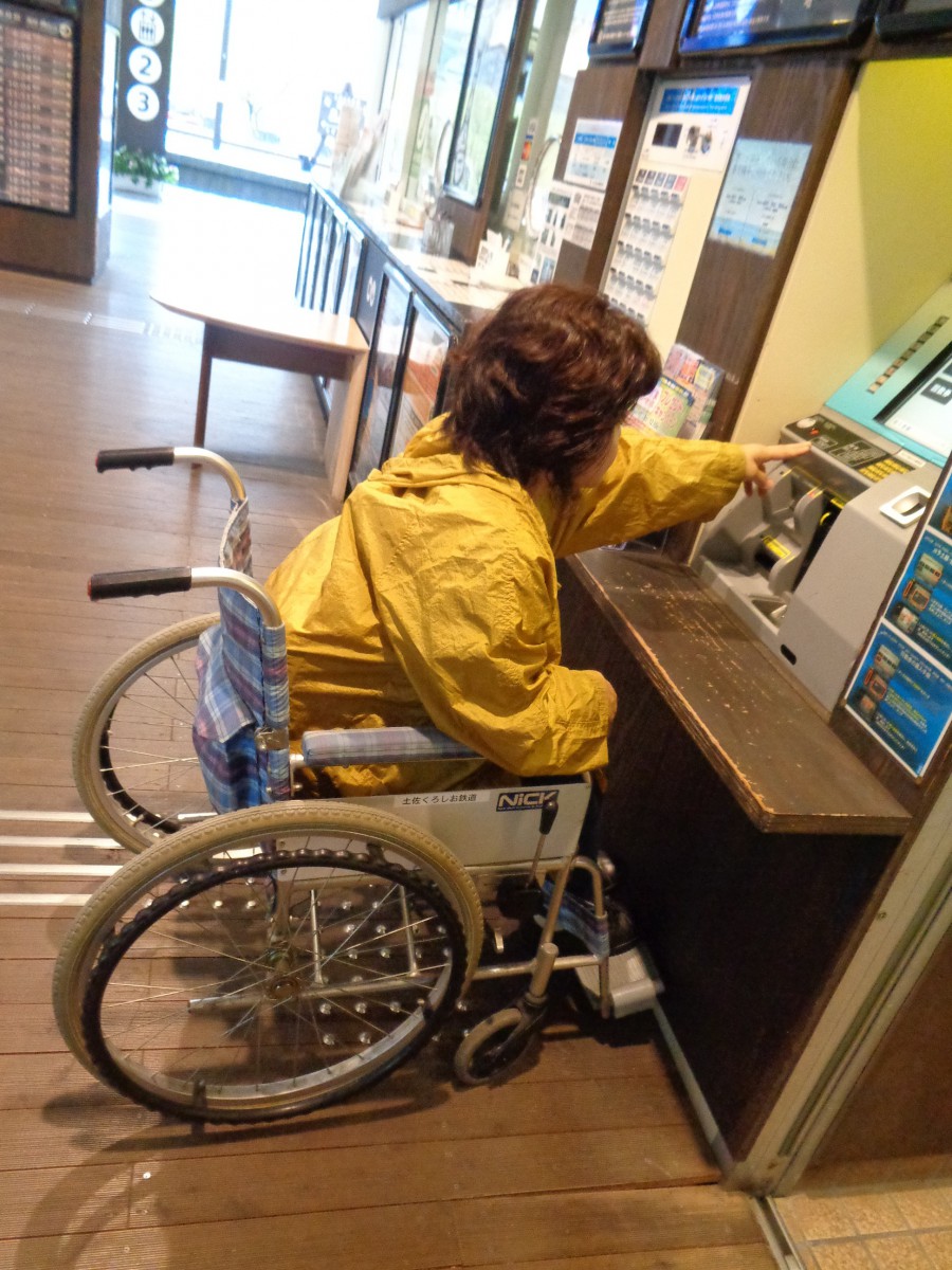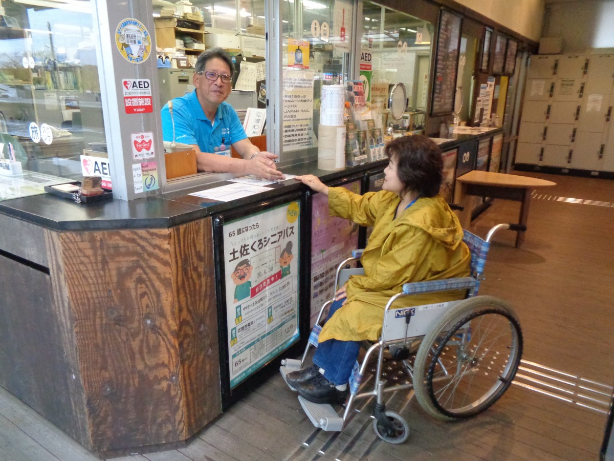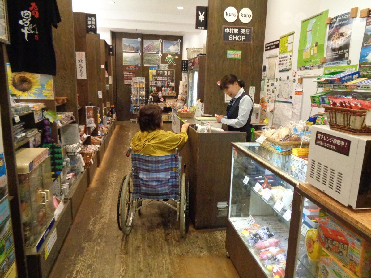 売店レジカウンターの高さ96センチ 通路は車いすで移動しやすい 混雑時は注意