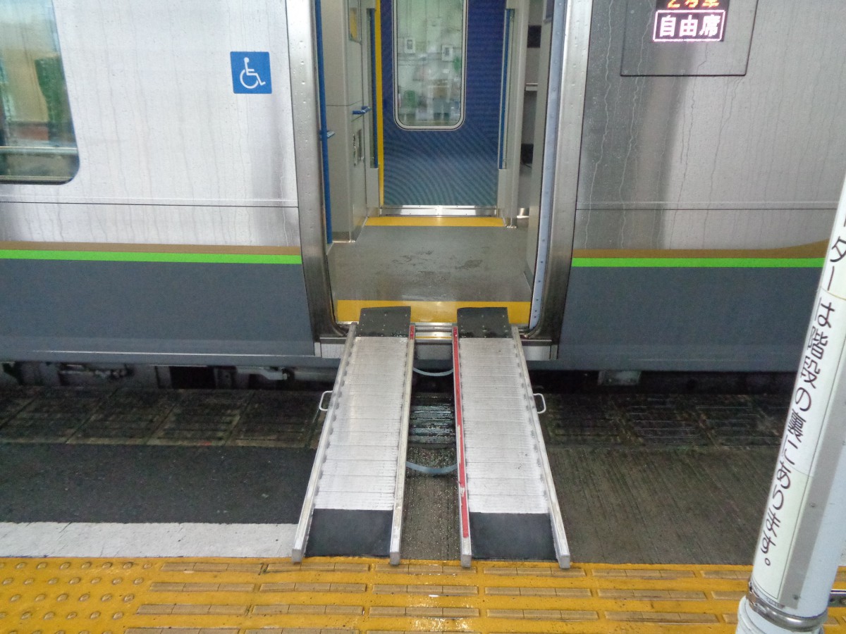 車両乗車口 簡易スロープ設置の様子 設置していない時の段差17センチ