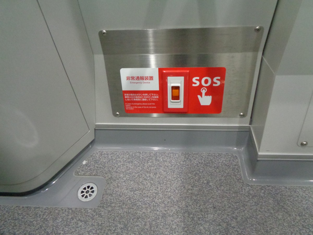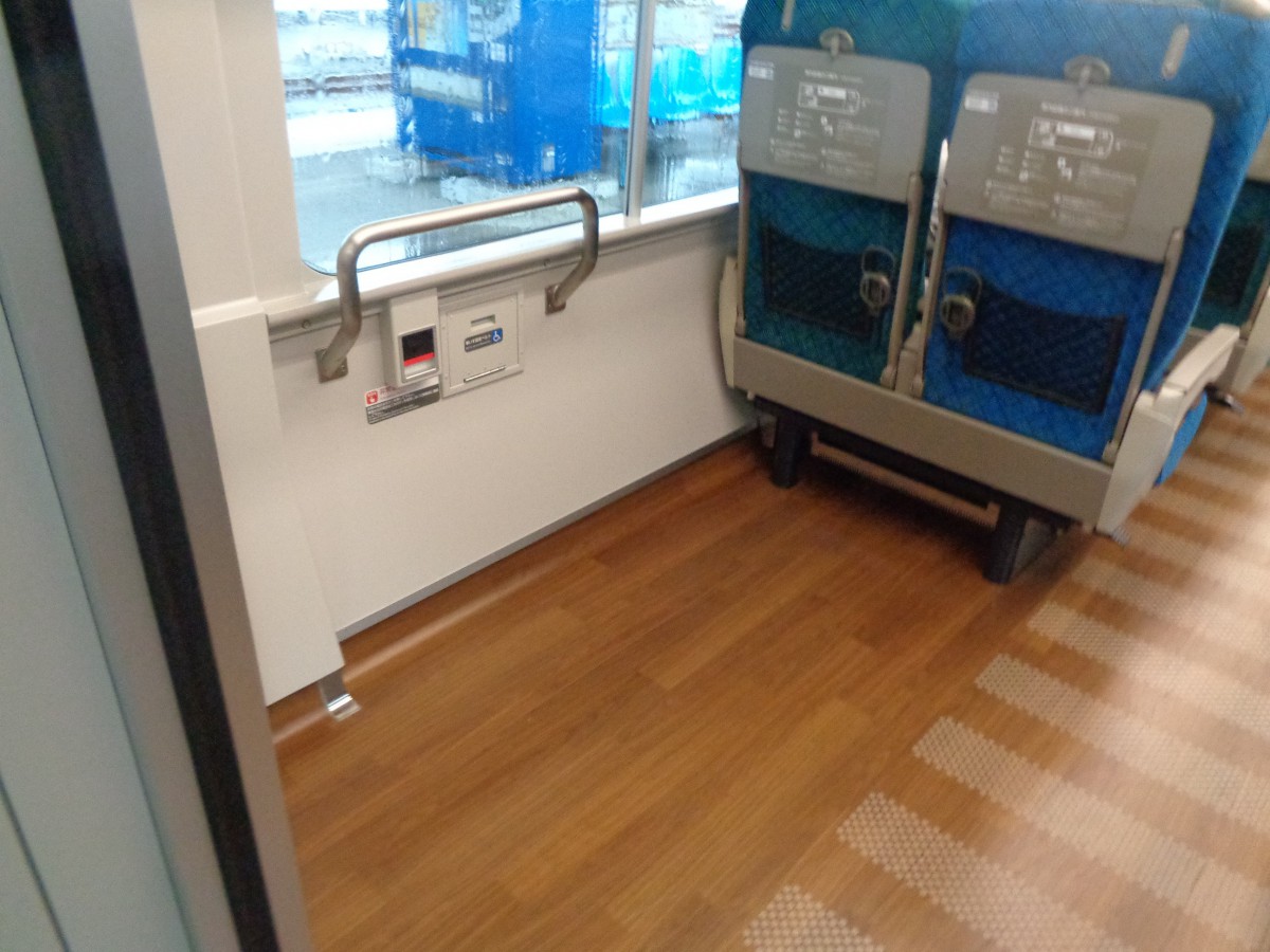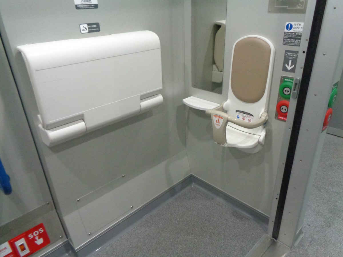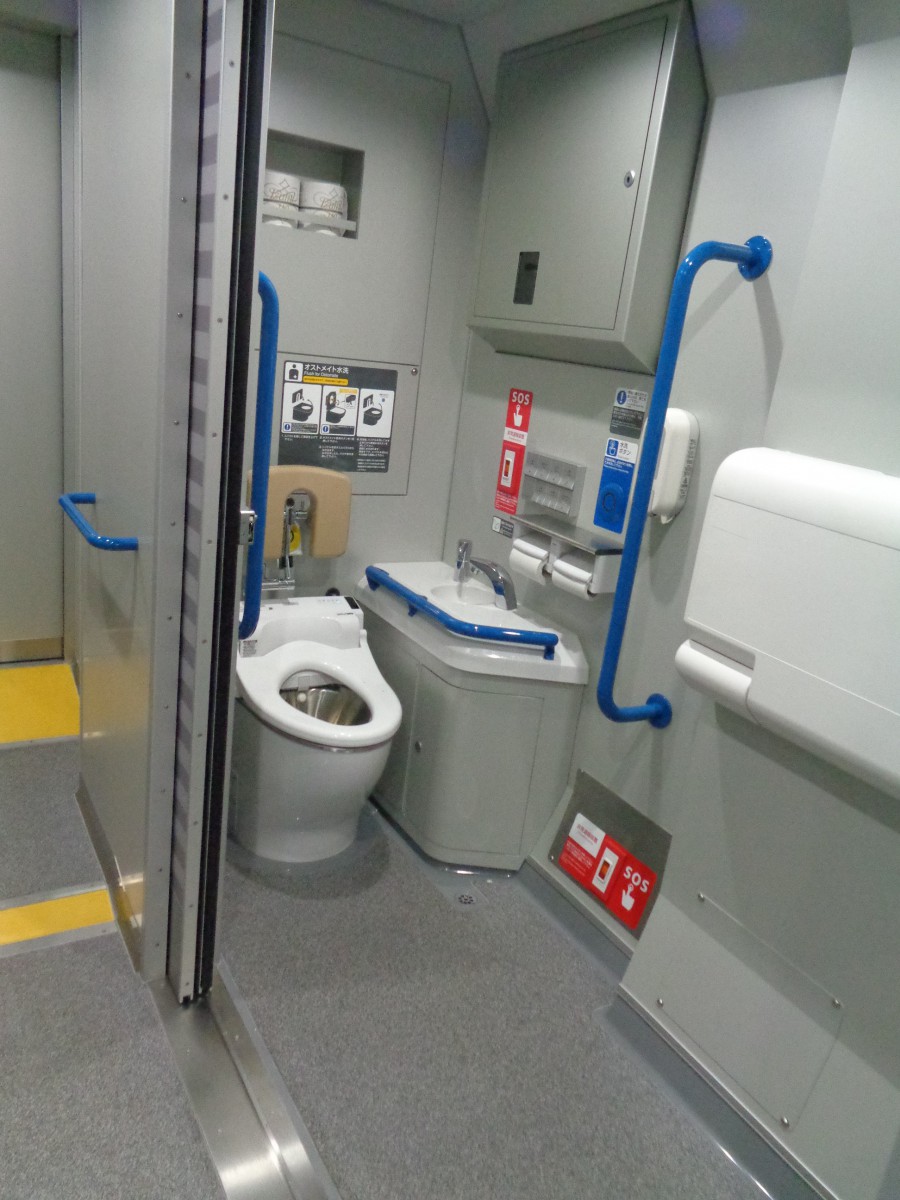 車内トイレ スライド戸 開閉ボタン 入口幅125センチ 手すり右側I字 左側L字 温水洗浄便座 操作パネル壁面