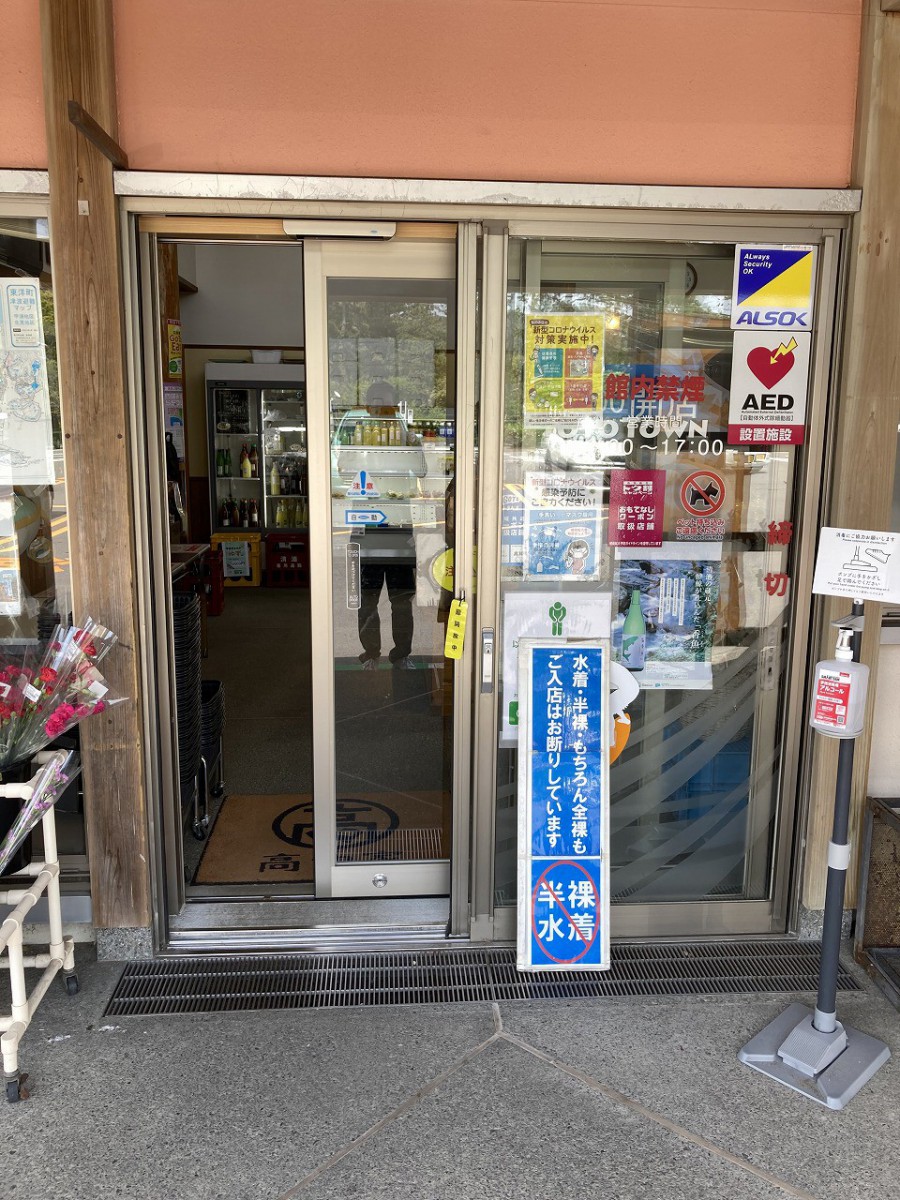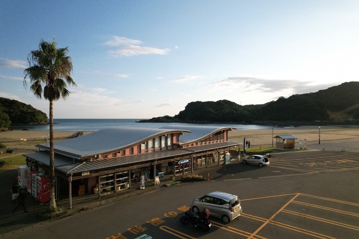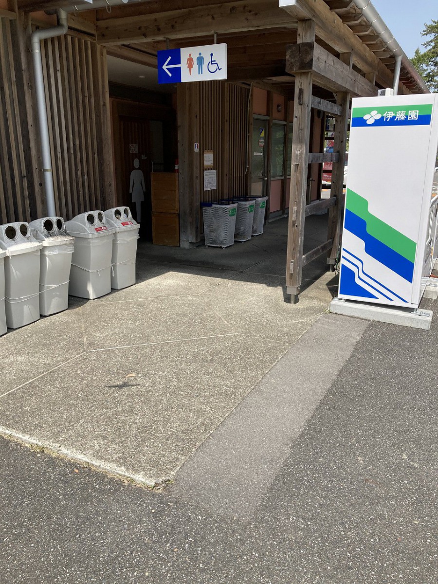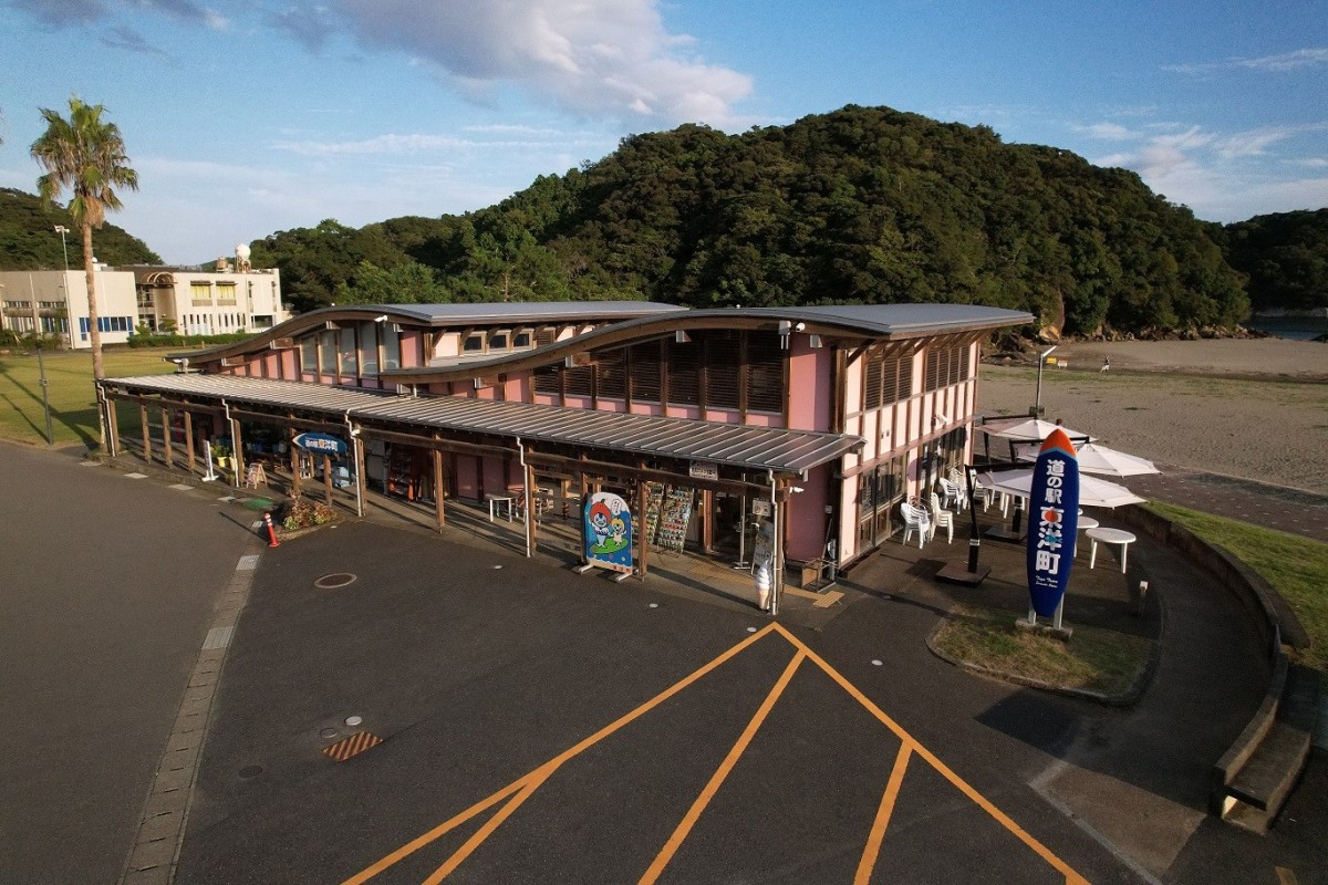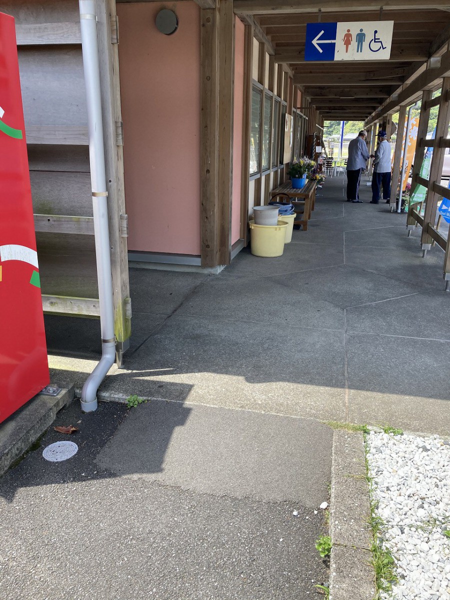 正面入口の様子 道の駅東洋町の看板の左にステップがあり、右側は緩やかなスロープになっている