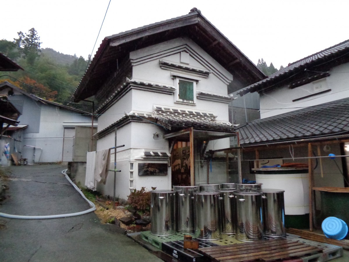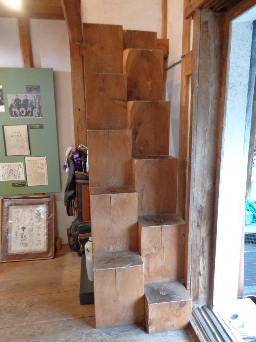 資料館2階への階段 傾斜60度以上の変形階段 手すり代わりのロープが設置されているが、昇降にはじゅうぶん注意が必要