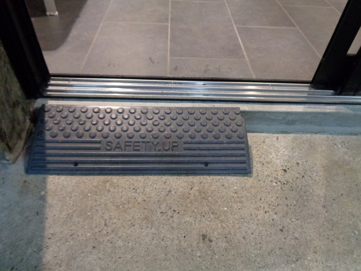 販売所入口のかまぼこ型スロープ 幅60センチ 長さ21センチ 傾度22度 車いす利用者は介助がいるとよい