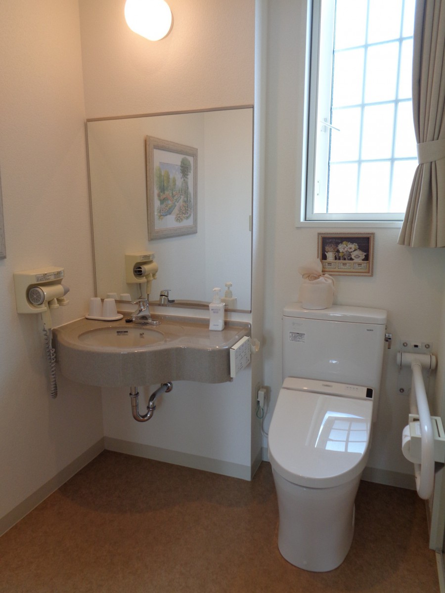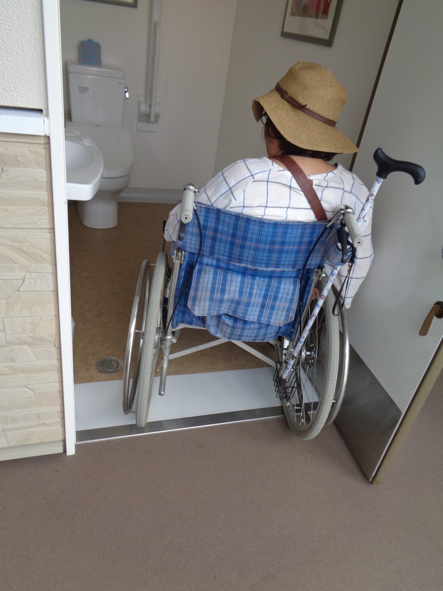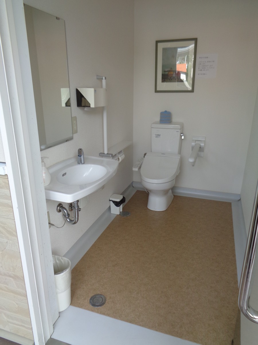 1階「誰でもトイレ」 車いすの方も一般の方も利用できる 折れ戸 入口幅90センチ 段差なし