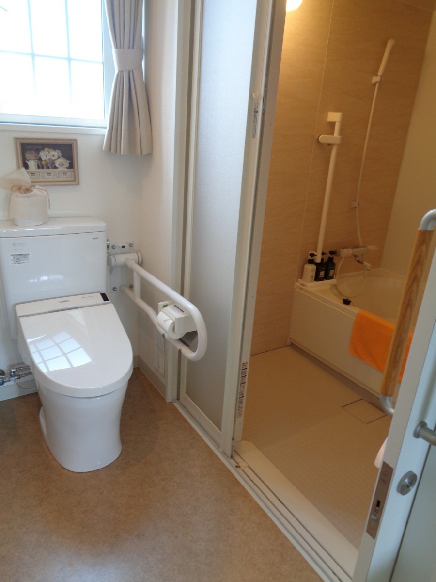 洋式 温水洗浄便座 操作パネルは洗面台側 右側にU字手すりあり
