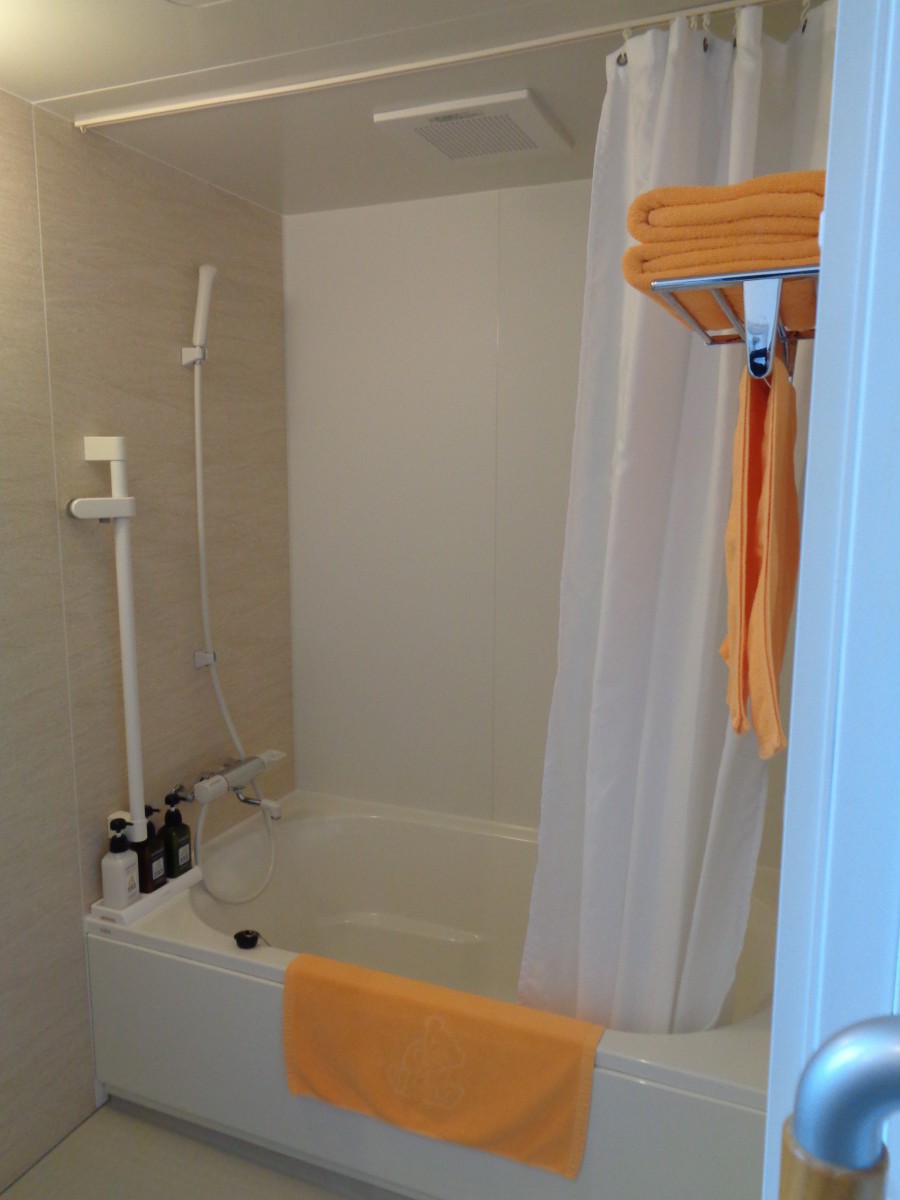 浴室 壁面にシャワーホルダー兼用のI字手すりあり