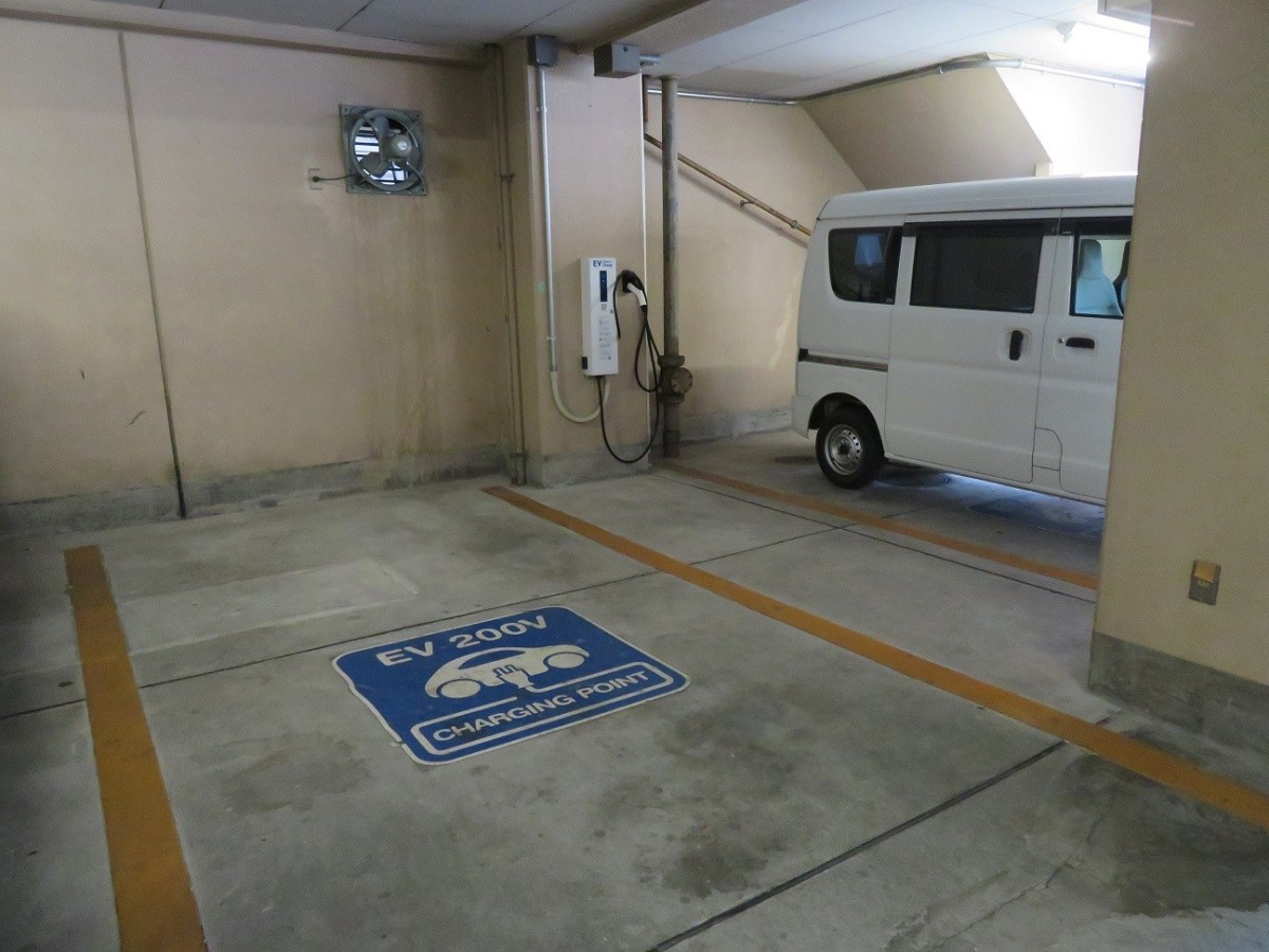 一般車の駐車場 屋内12台 屋外10台 障害者用駐車場はないが、障害者マークの車は優先的に入口に近いところを案内 EV充電スタンド2基設置