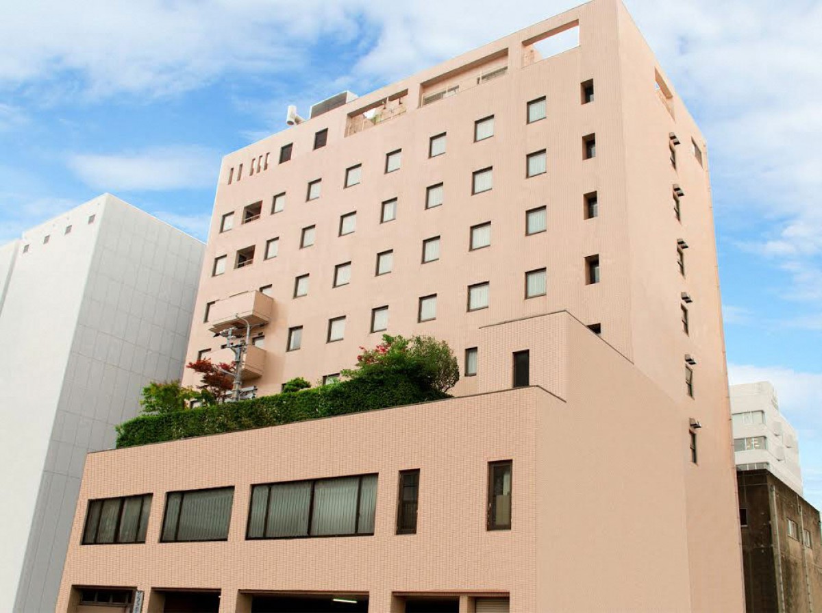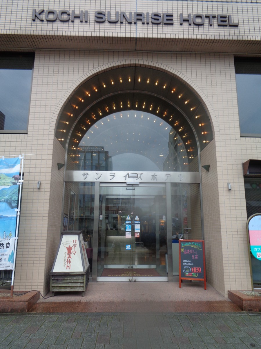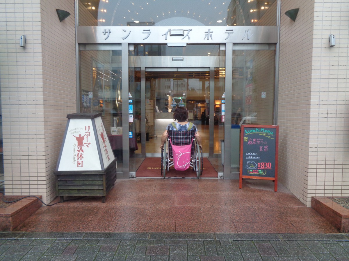 南側駐車場からホテル入口 外扉は自動ドア 入口幅112センチ段差なし 中扉は開放 入口幅75センチ 常設スロープあり 傾斜8度