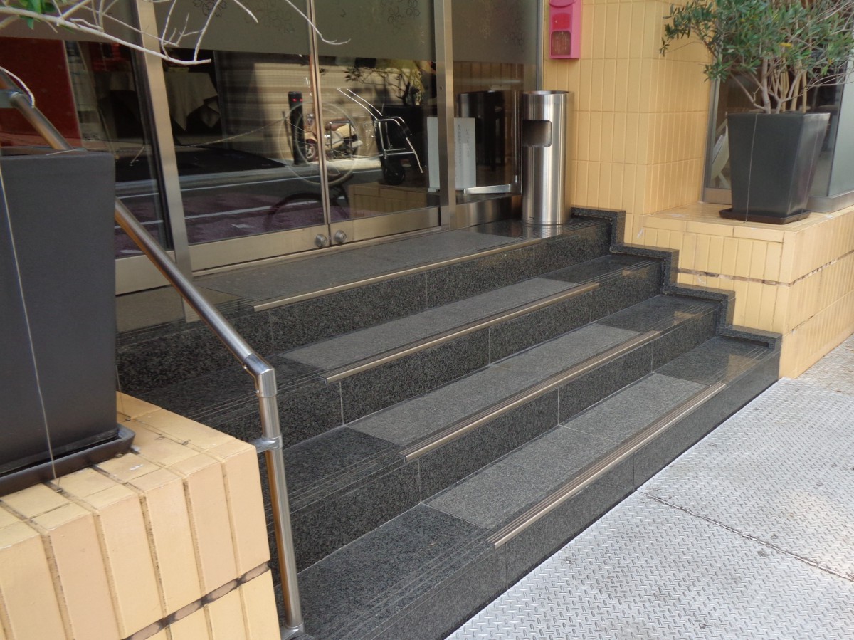 正面入口手前の階段 手すりあり 階段を上ったところにインターフォンあり(高さ117センチ)