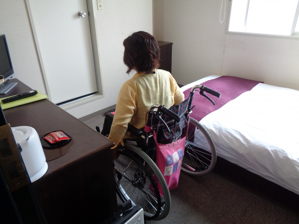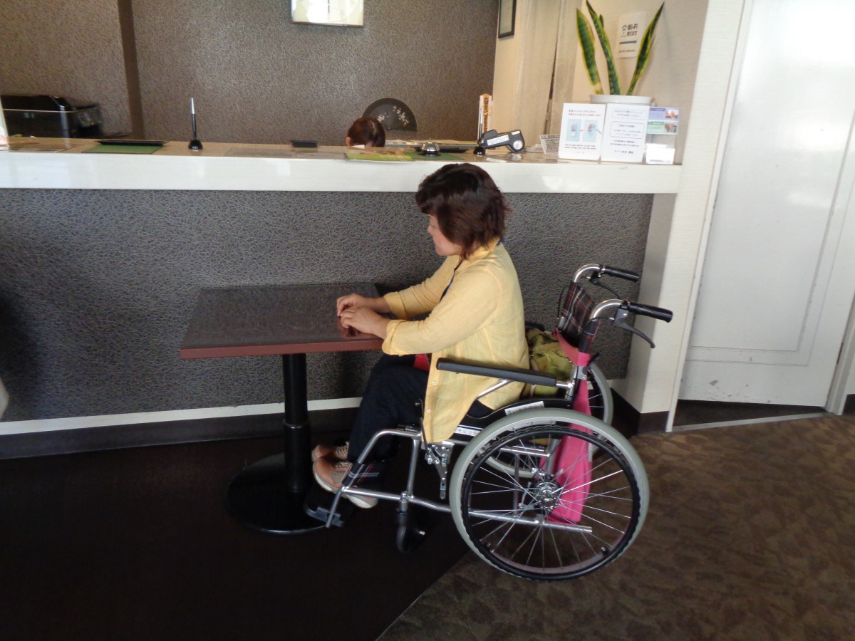 フロントのカウンター前に荷物置きのテーブルがあり、チェックイン時に車いすで利用できる高さ(68センチ)