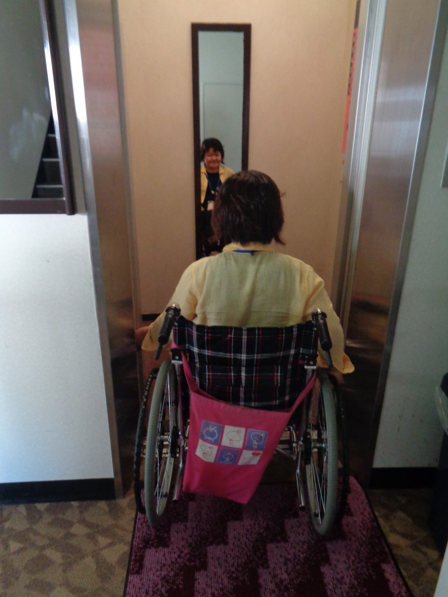エレベーターは館内に1基 入口幅80センチ 後方確認用鏡 階表示あり