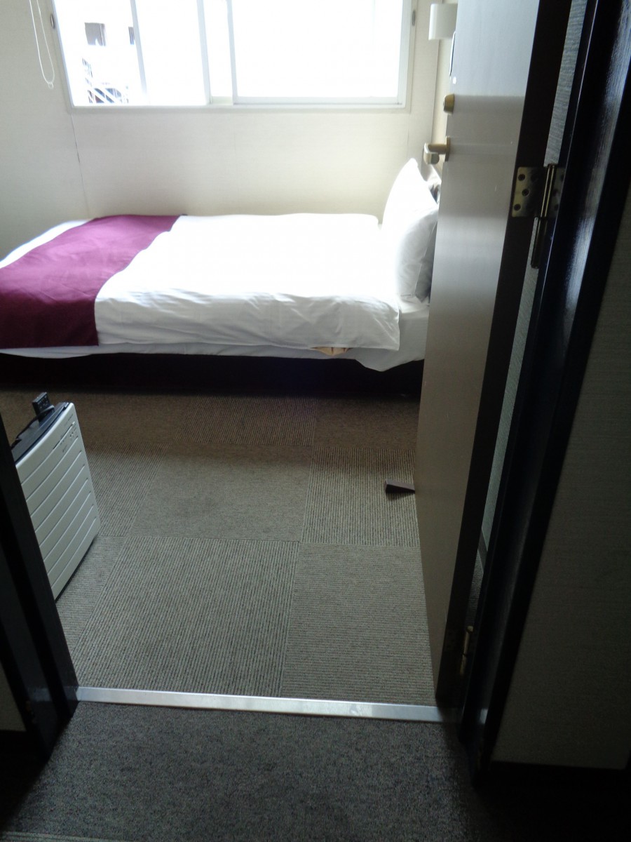 入口から客室を見たところ、ベッドの高さ35センチ 枕元集中スイッチあり