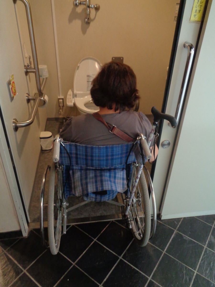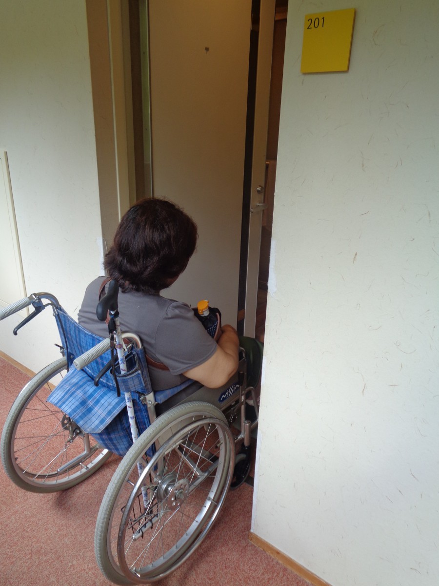 浴室入口 車いす利用者は介助者同伴で利用することができる スライド戸 入口幅84センチ 段差あり1段目7センチ 2段目15センチ 滑らないように注意