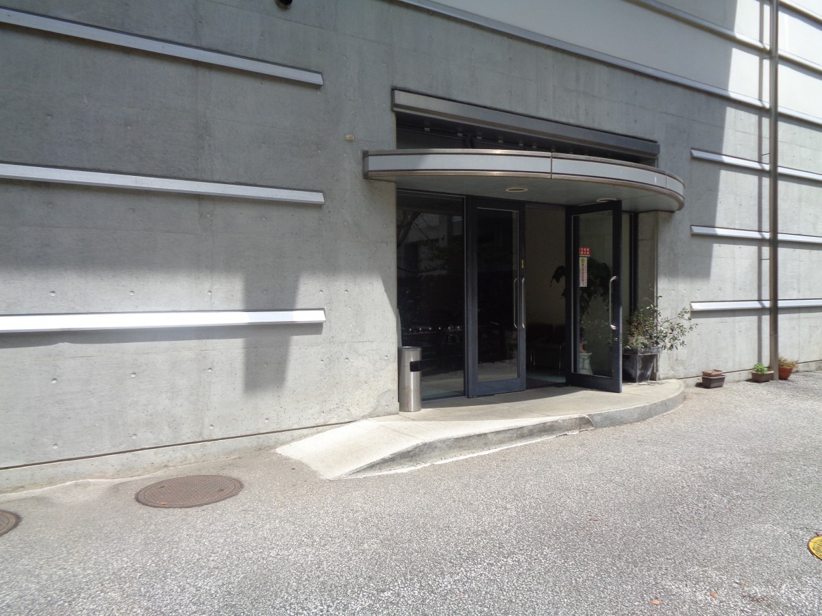 正面入口前は緩やかに傾斜している 自動ドアを入ると内側の扉は開き戸 フロントで敷地内の案内図をもらうと館内移動がスムーズ