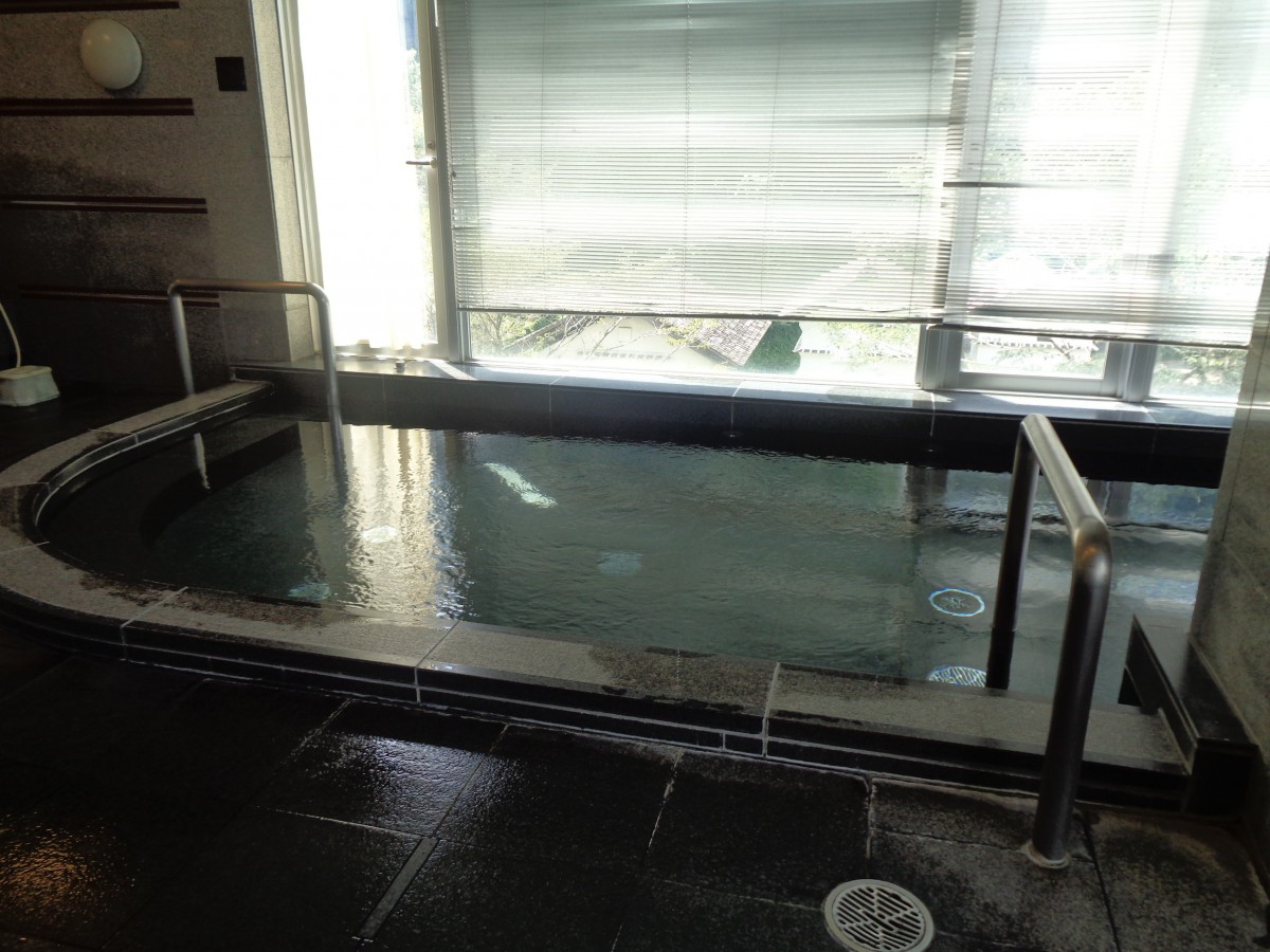 浴層入口に手すりあり お湯は薬湯 毎日薪で沸かしていて肌あたりが柔らかい
