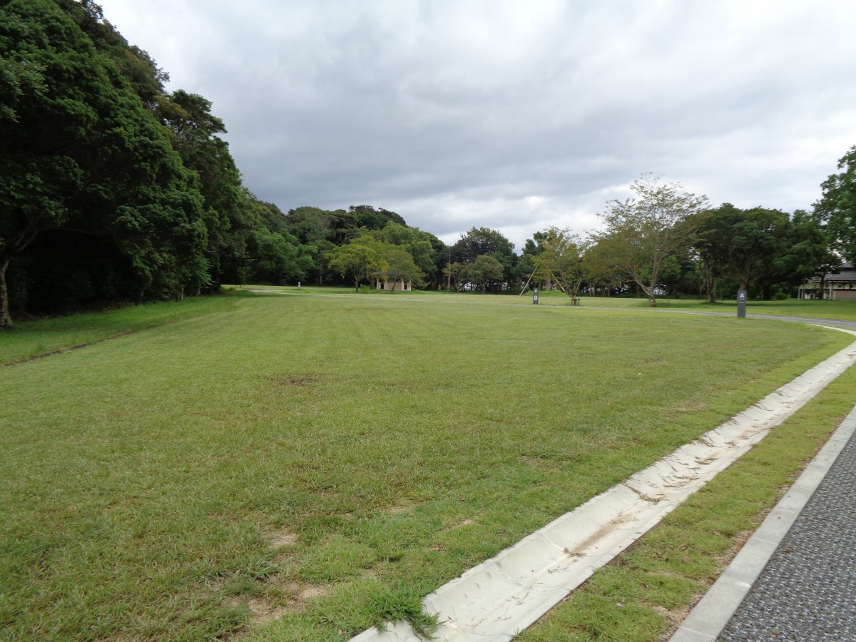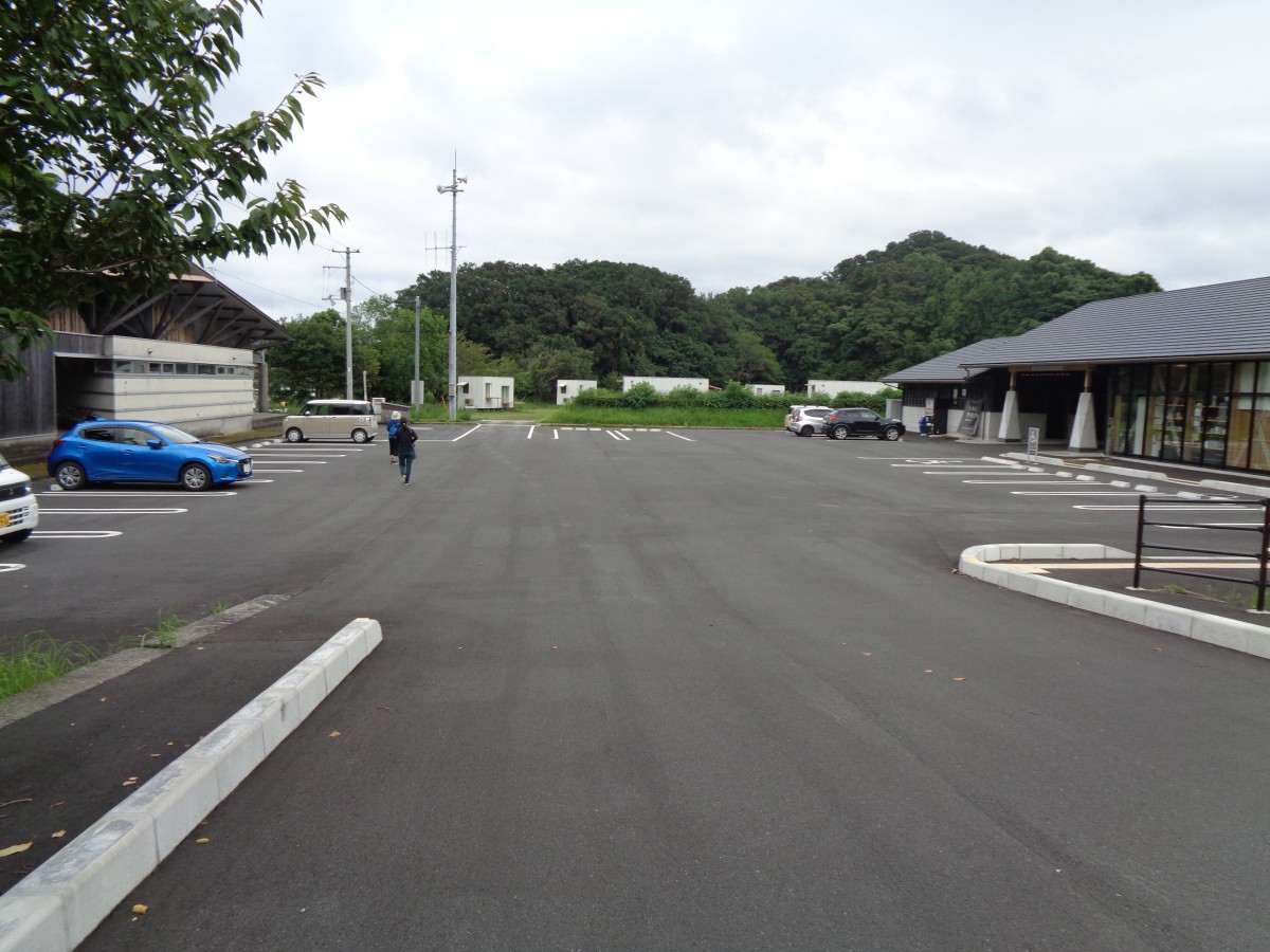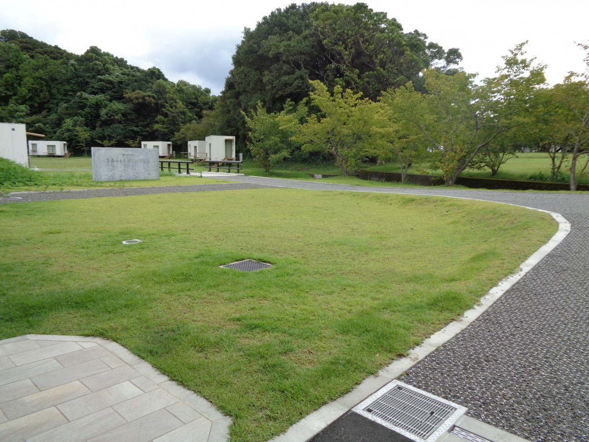 通路の様子 キャンプ場側から駐車場の方向にむかって、左が管理棟・右がサニタリー棟