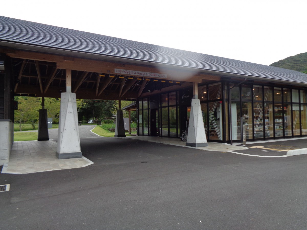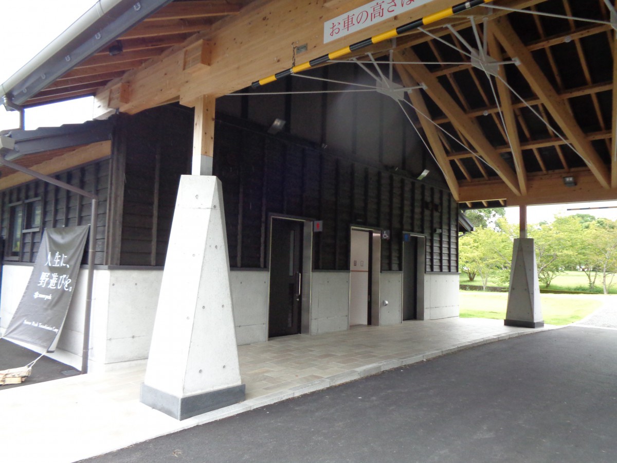 管理棟とサニタリー棟が通路を挟んである 通路の向こうがキャンプ場