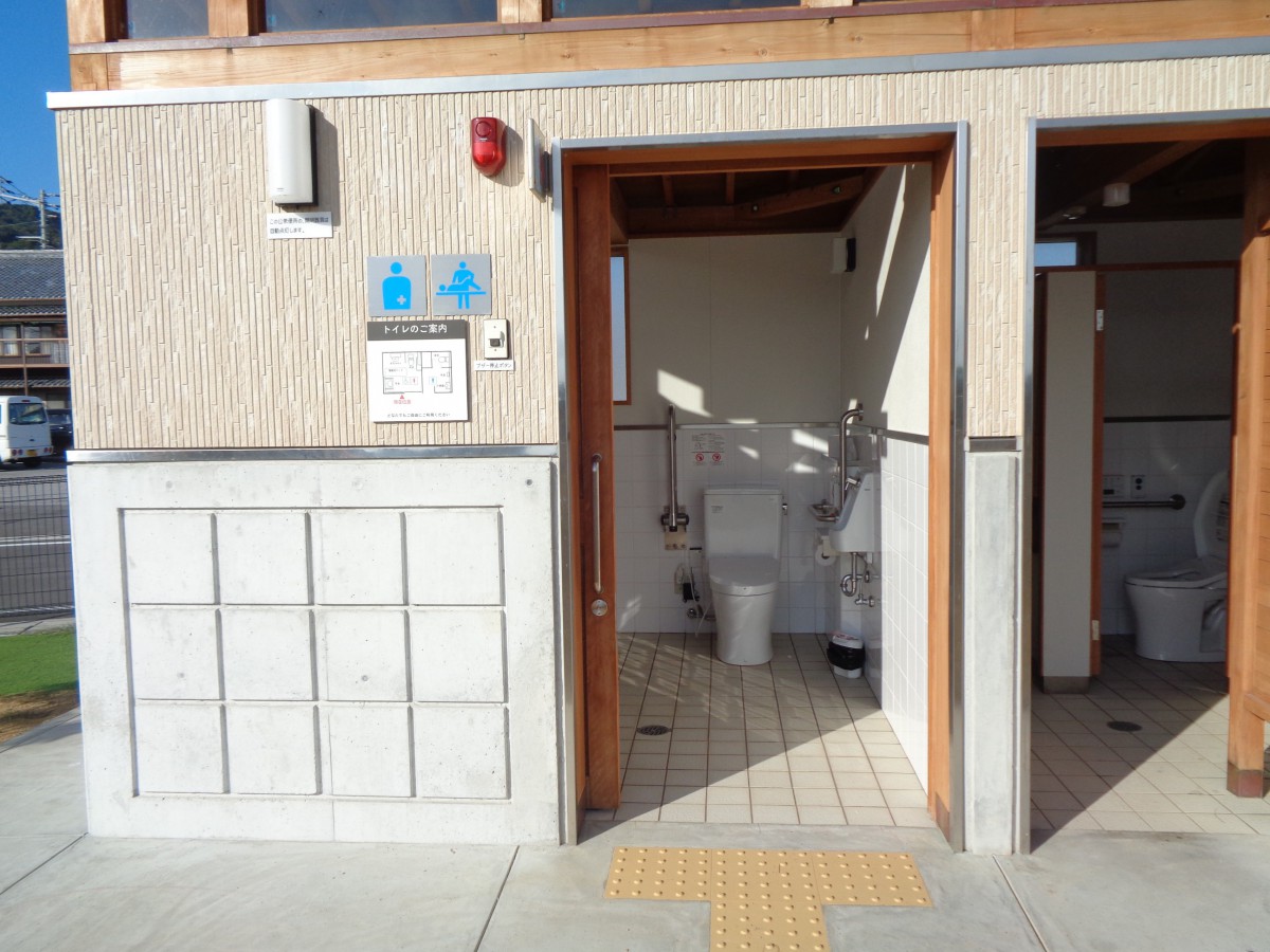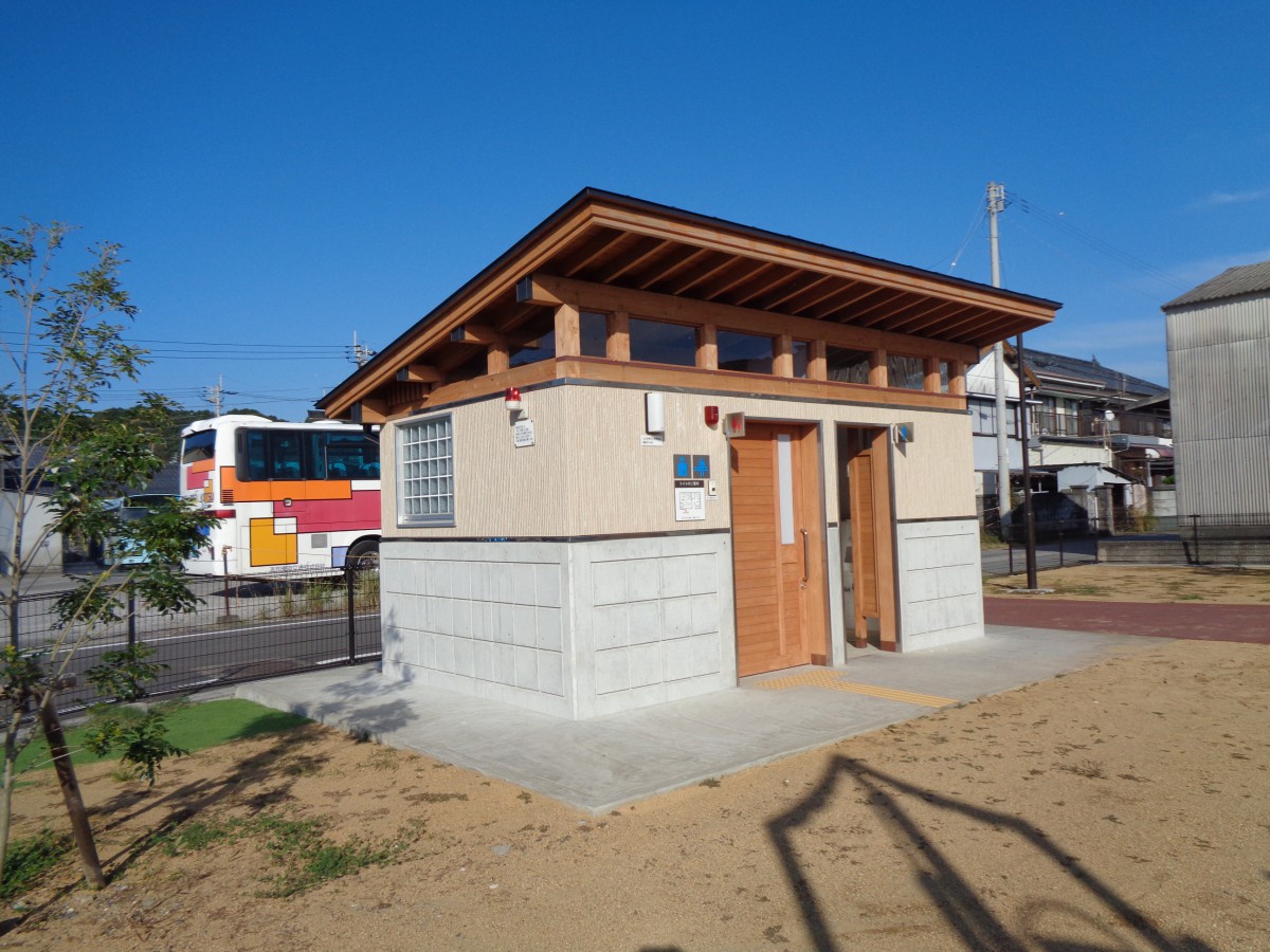 営業所南側公園にあるトイレ棟 車いす対応トイレ女性用と共用、一般共用トイレ男性用あり