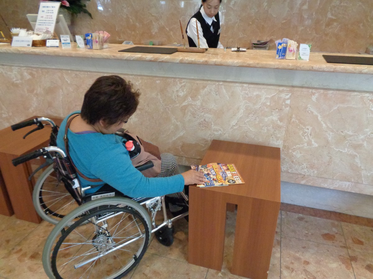 フロント 受付カウンター高さ109センチ 荷物置き用の低い台やロビーのテーブルで車いす利用者はチェックインができる