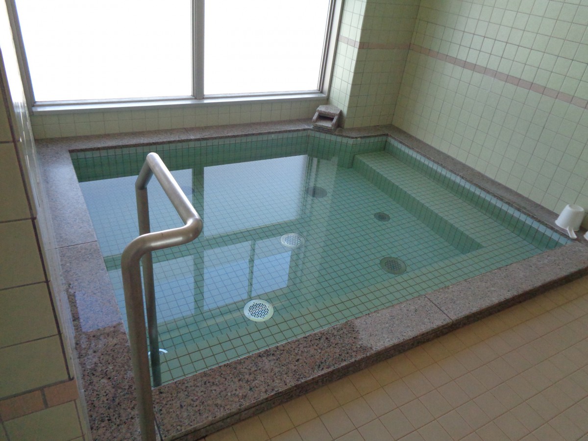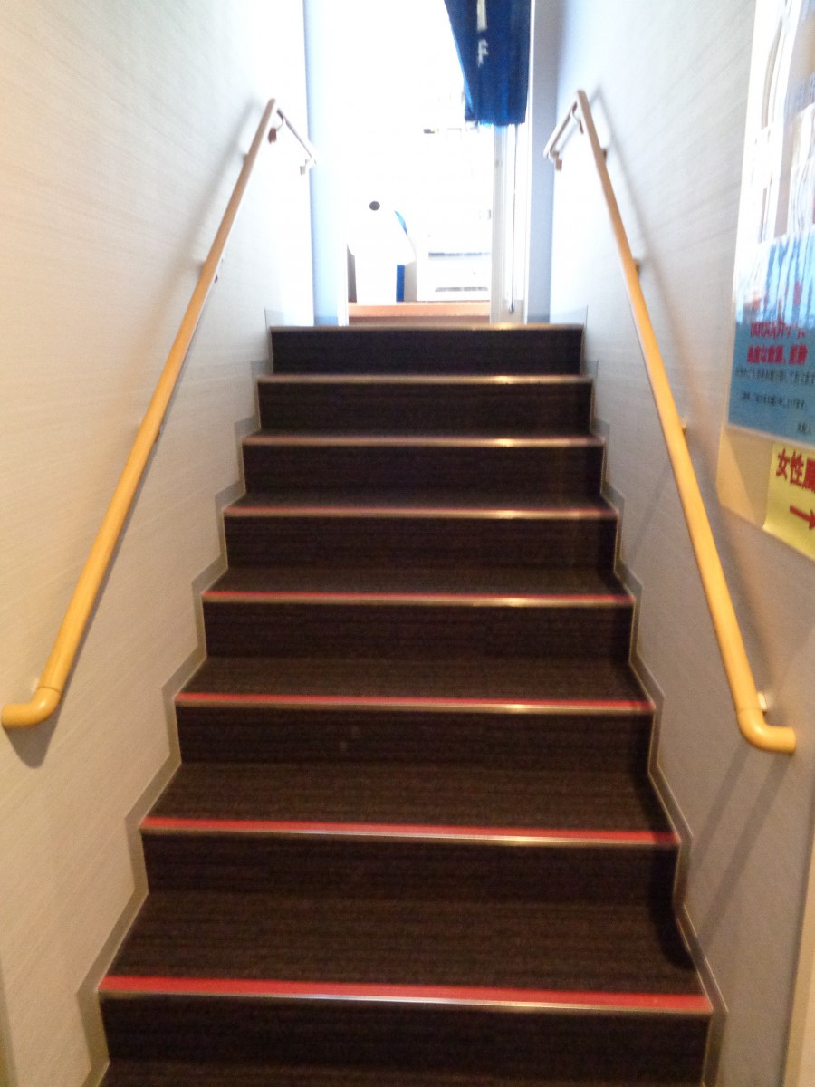 大浴場男湯の入口へは階段8段(両側手すり付き) 女湯入口へは階段4段(手すりなし) 車いすでの利用は難しい