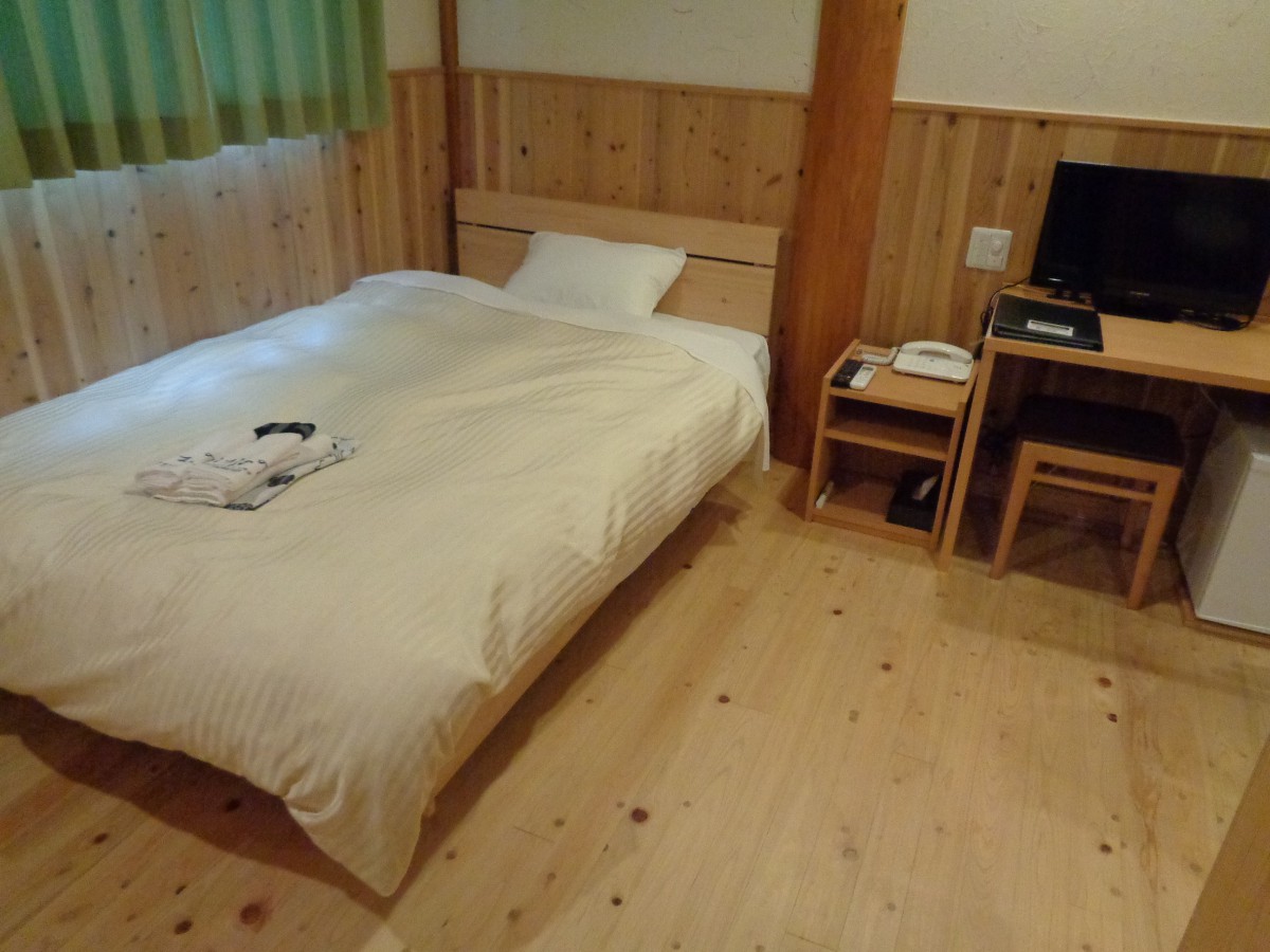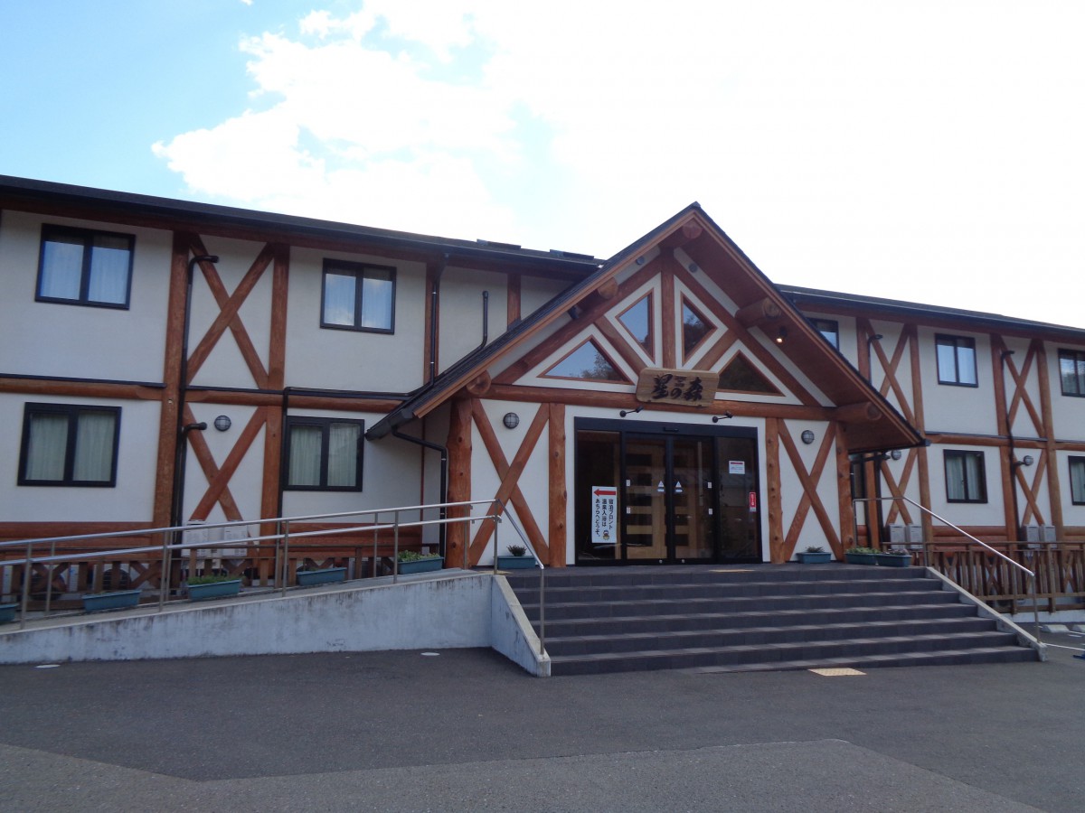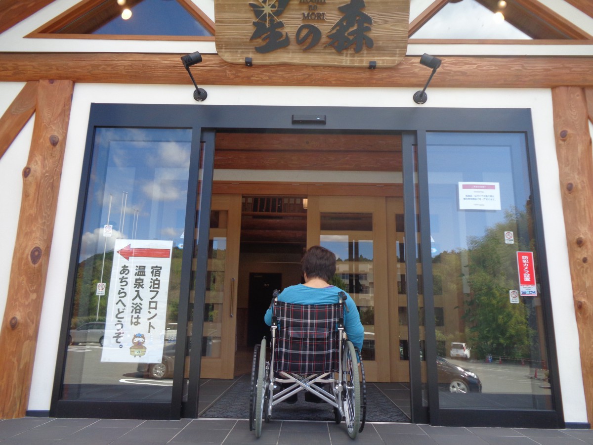 正面入口 外扉自動ドア、内扉スライド戸 ログハウス内 土足禁止 車いすはタイヤを拭くこと