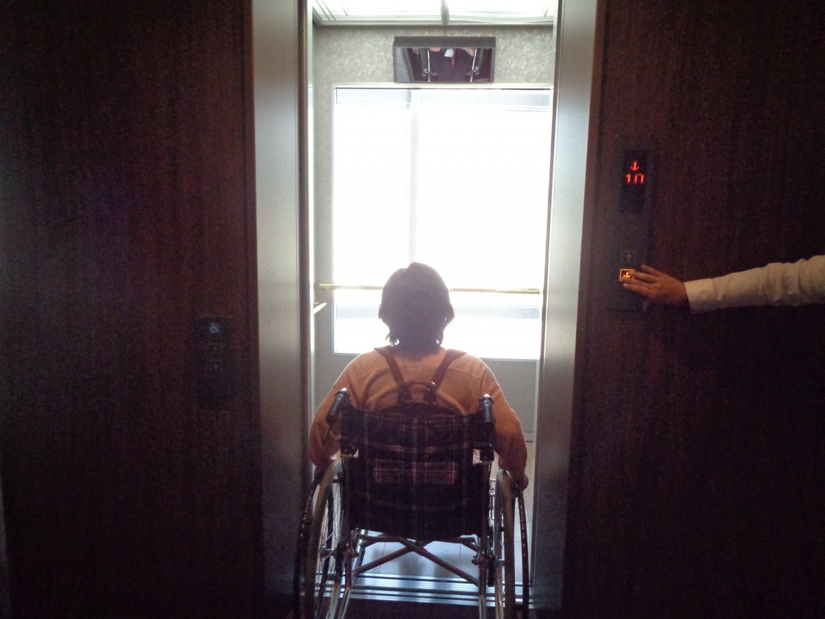エレベーター 外観が眺望できるタイプ 後方確認用鏡は背面上部に付けられている
